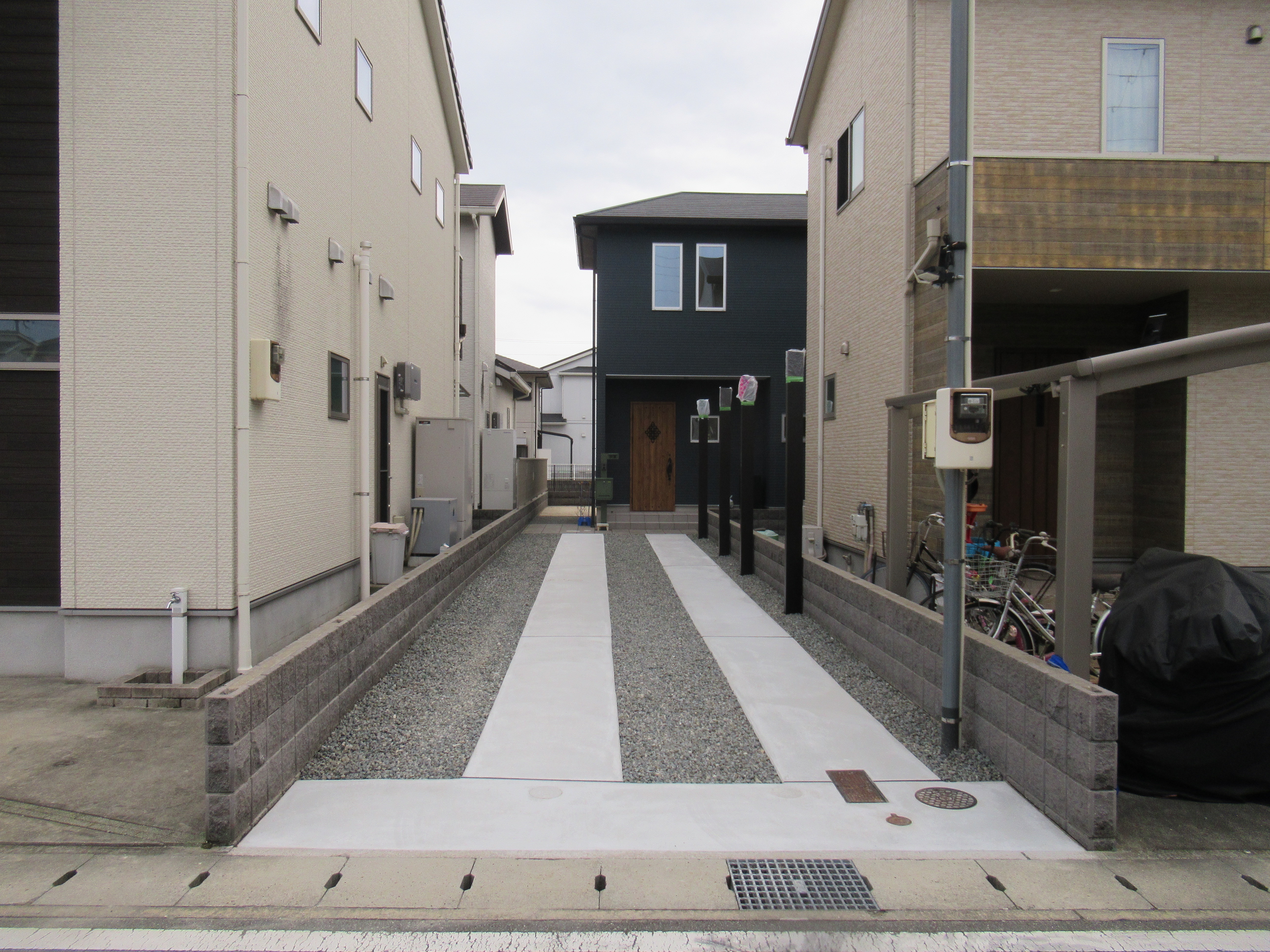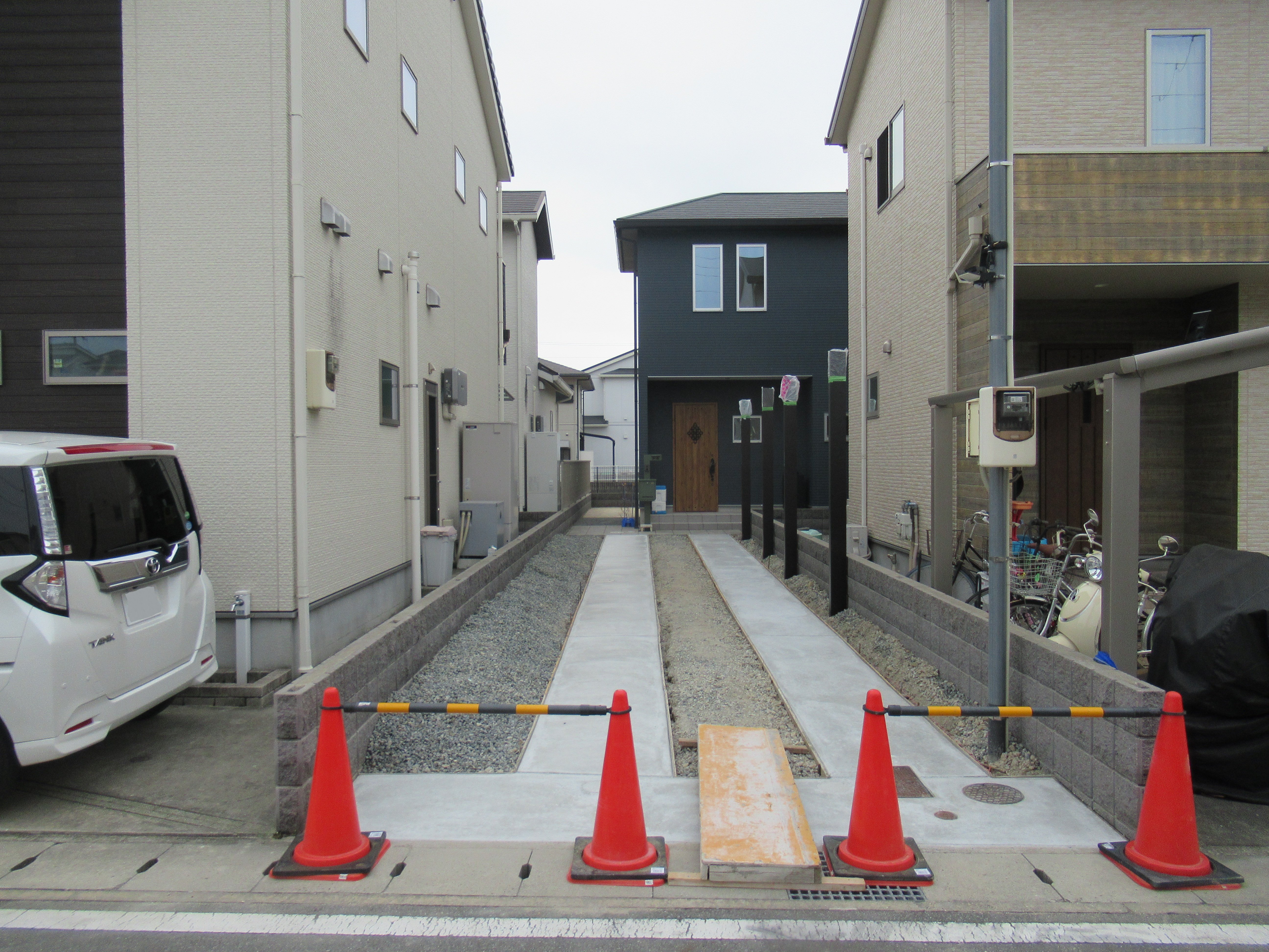 四年前の新築時の外構工事は「せっかくの戸建てなので、子供が遊べる芝生のお庭を優先したい。」というご施主様のご希望で、境界塀・玄関まわり・お庭を優先して作らせていただいて、ガレージは二期工事へと持ち越しました。