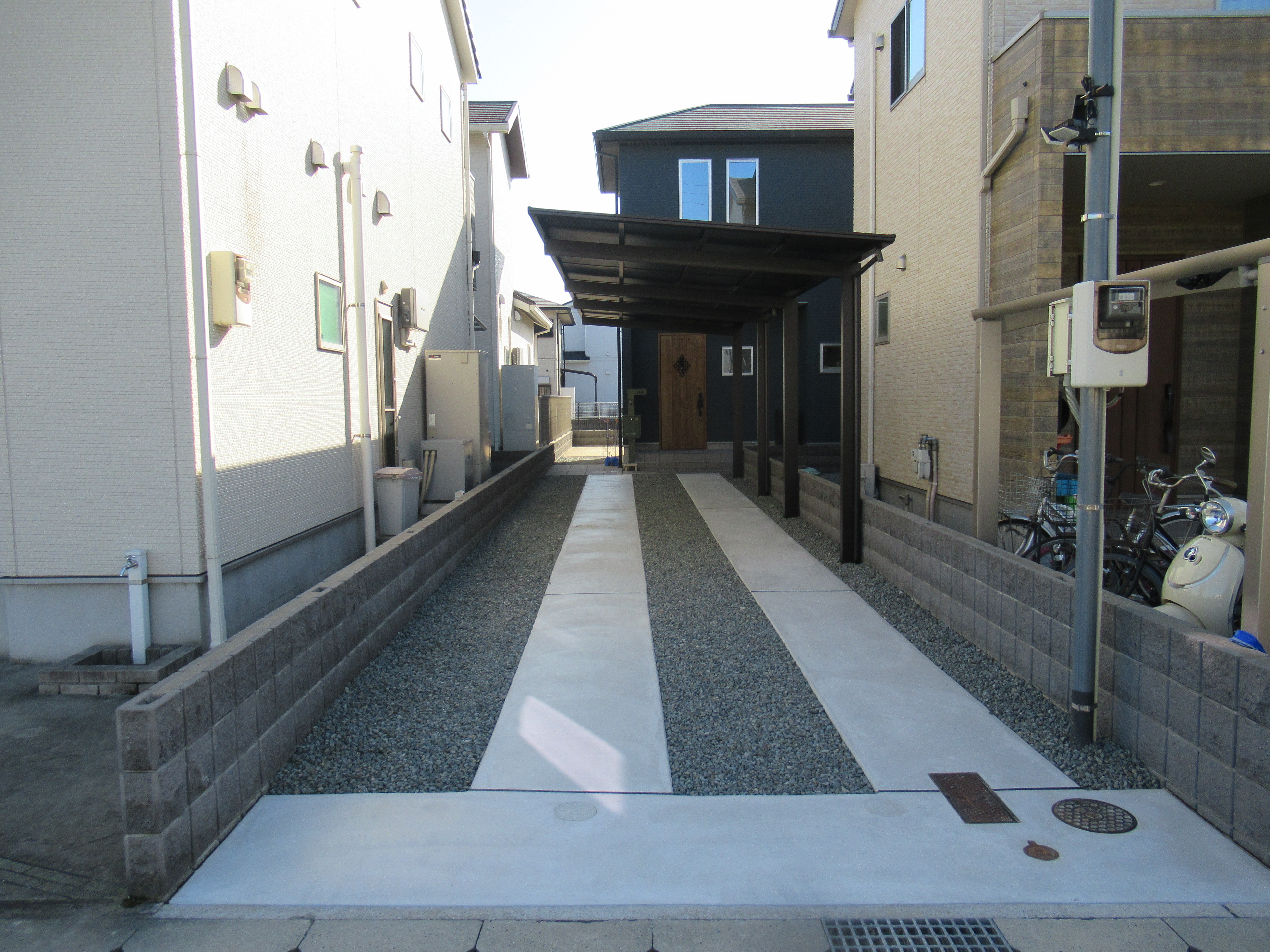 車3台が縦列駐車できる長いガレージは、砂利敷きのままで四年間お使いいただきました。