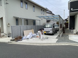 ガレージやアプローチに敷かれていた砂利を撤去して下地を作っています。