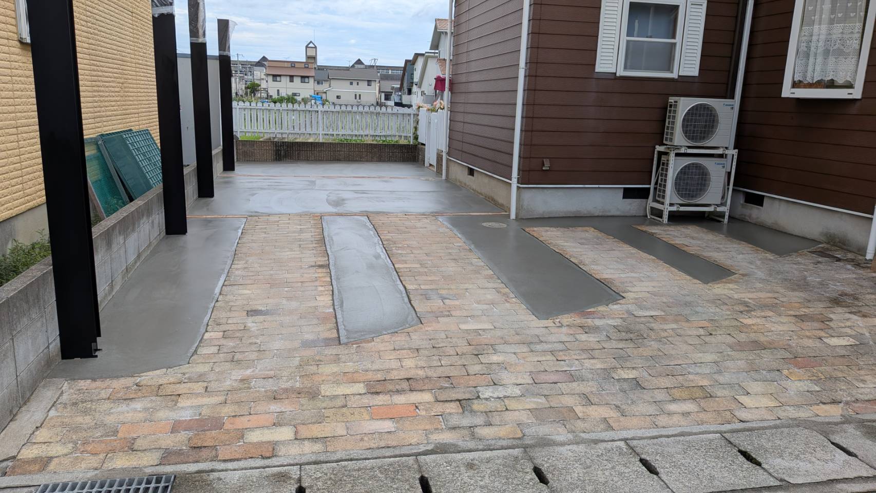 コンクリート打設完了後の写真です、数日間の養生後にカーポートSCとイナバ物置を組み立てます。