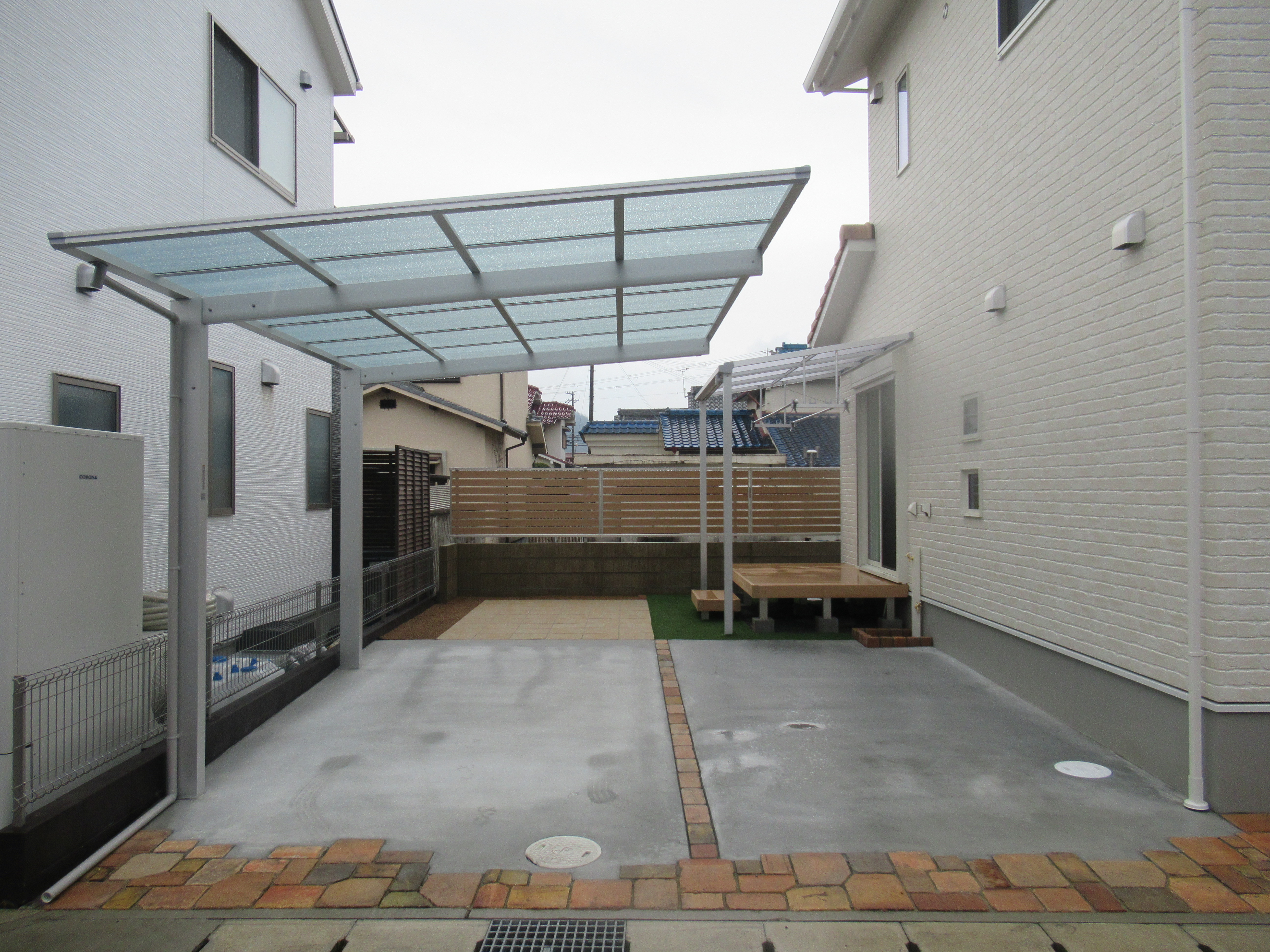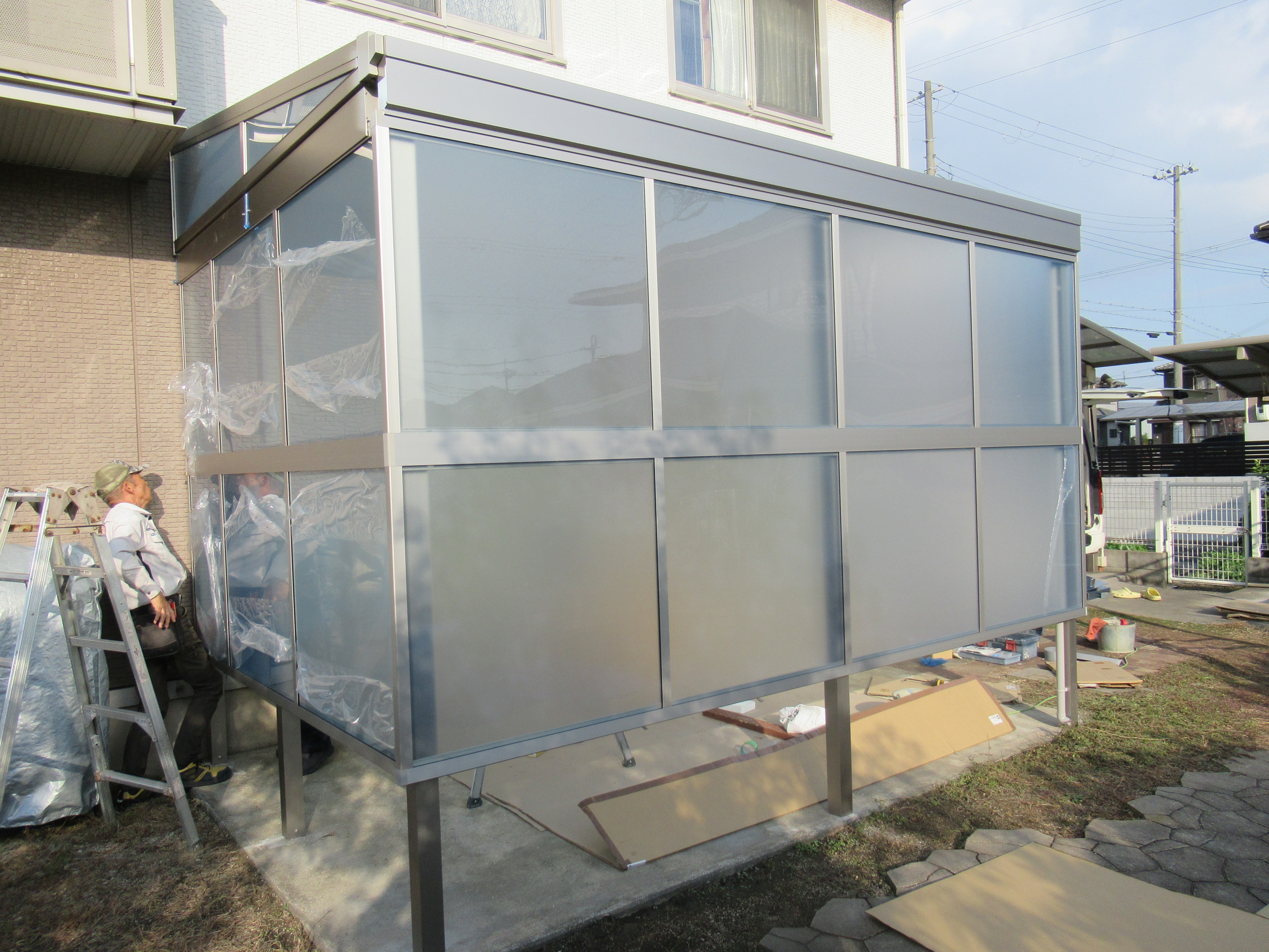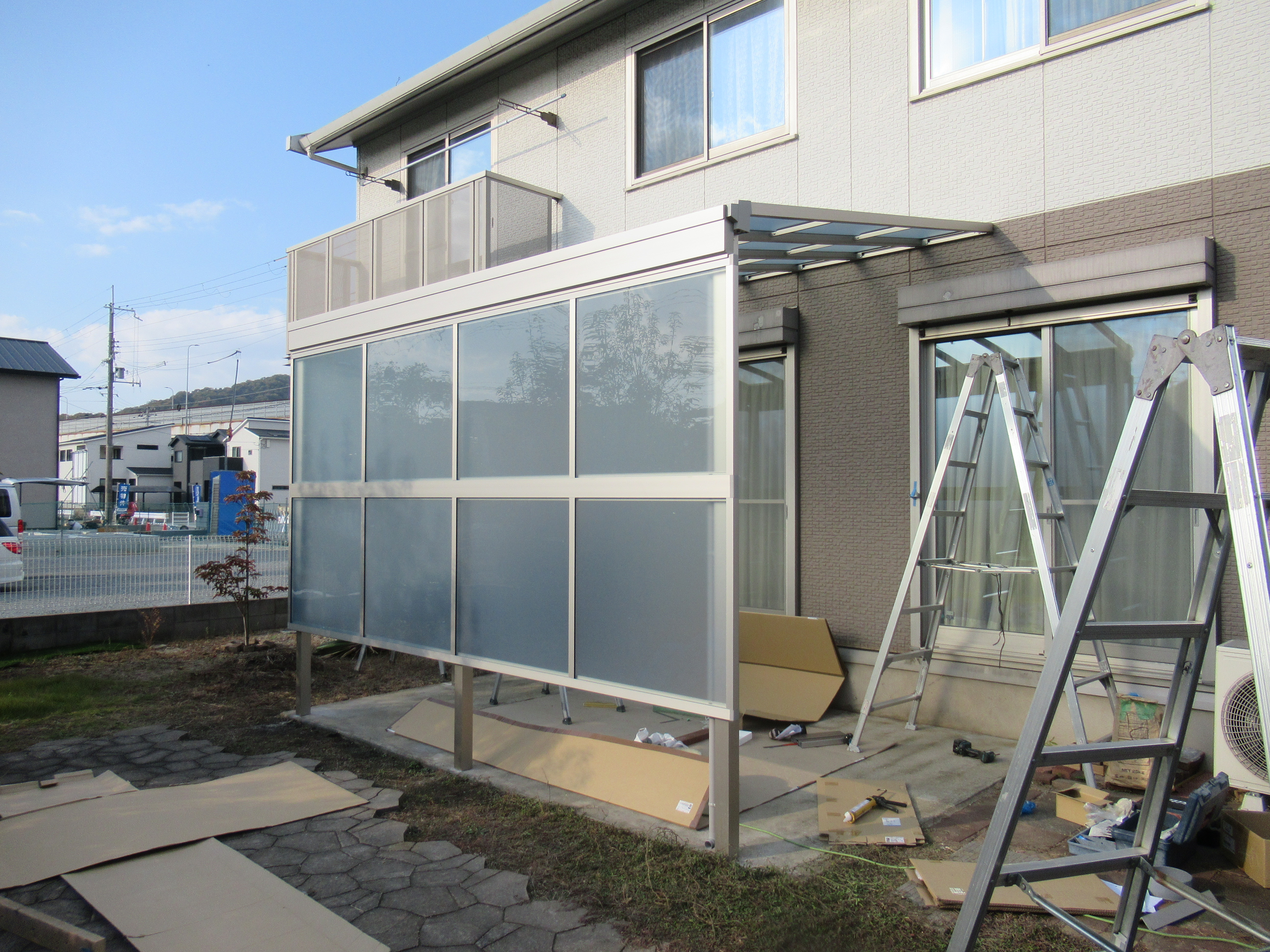 テラス屋根の正面・左側にパネルを取付けています、二面を塞いでバイク庫になります。
