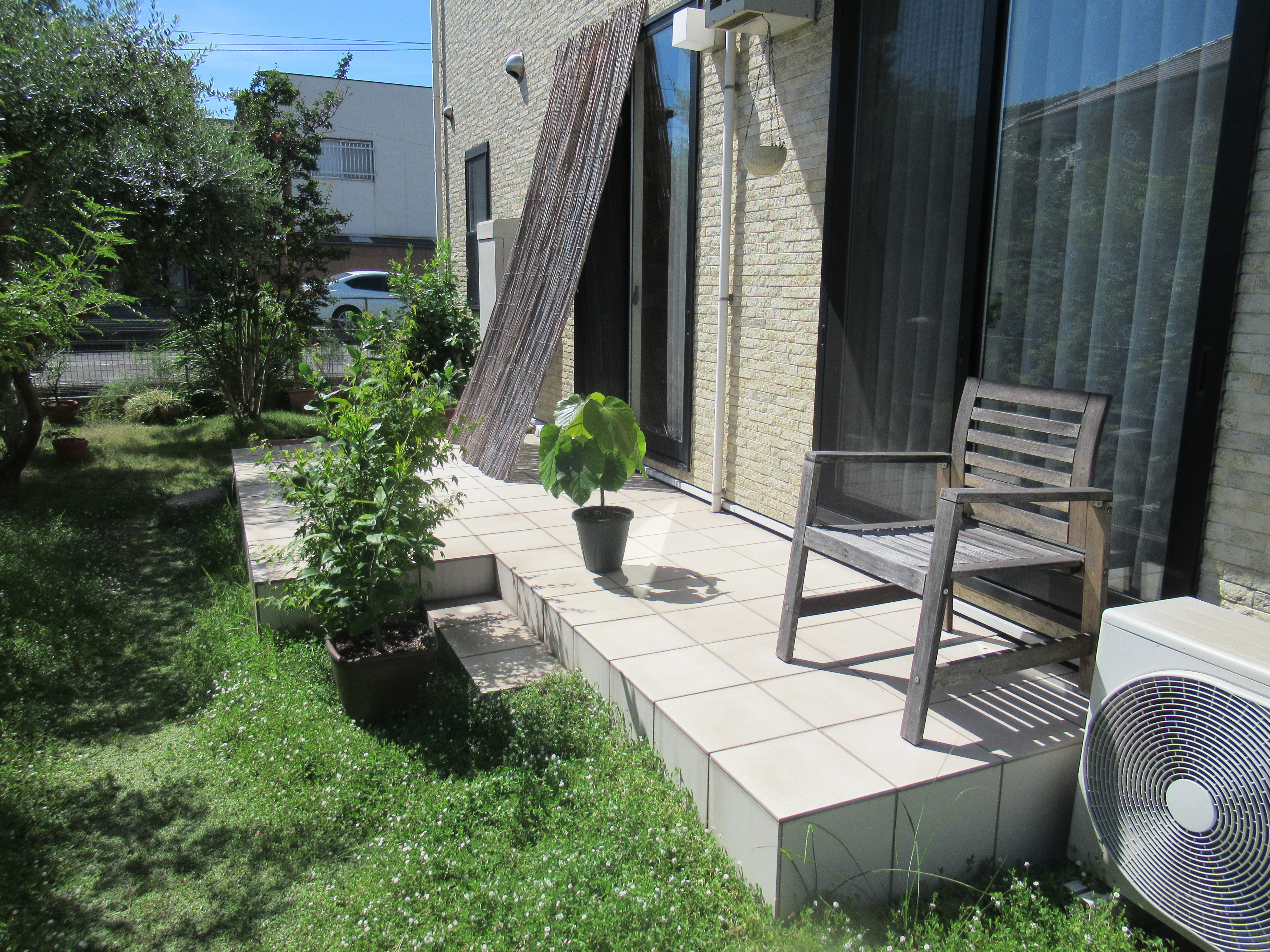 リビングの掃き出し窓2か所を繋ぐ大きなタイルテラスです。
