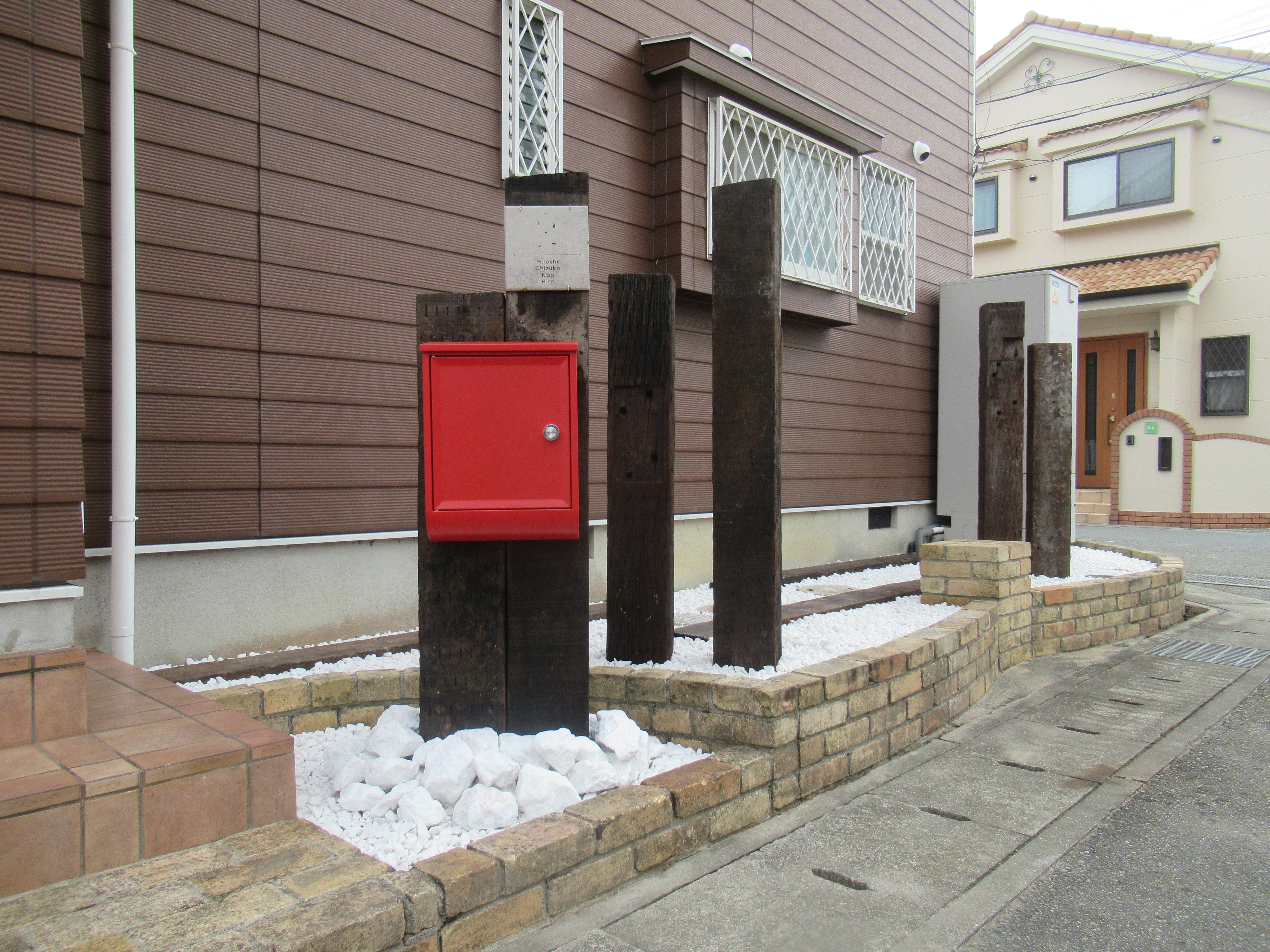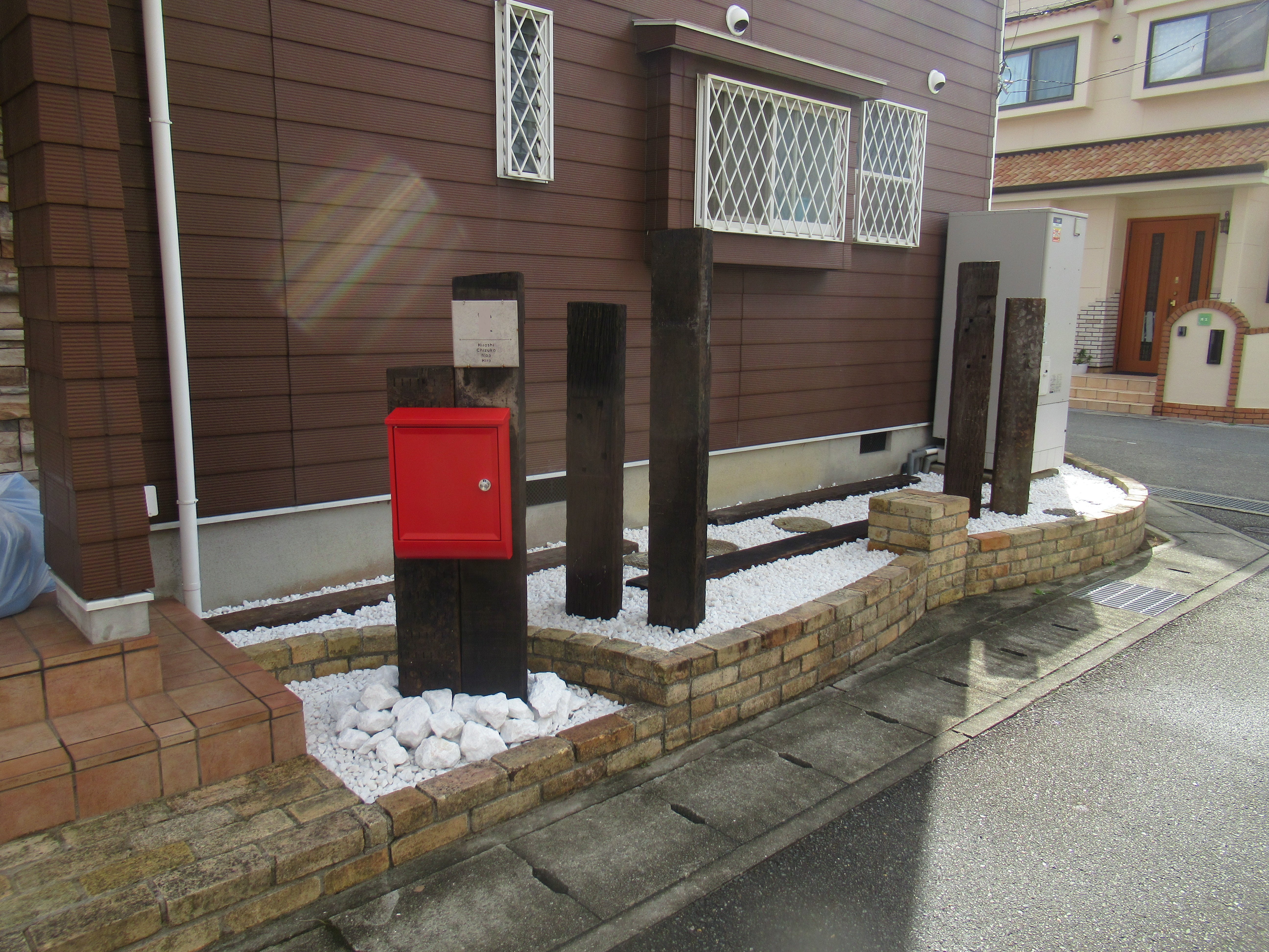 化粧砂利・ライトホワイト5分と栗石・ライトホワイト90~120を敷いて表札・ポストを取付けて完成です。