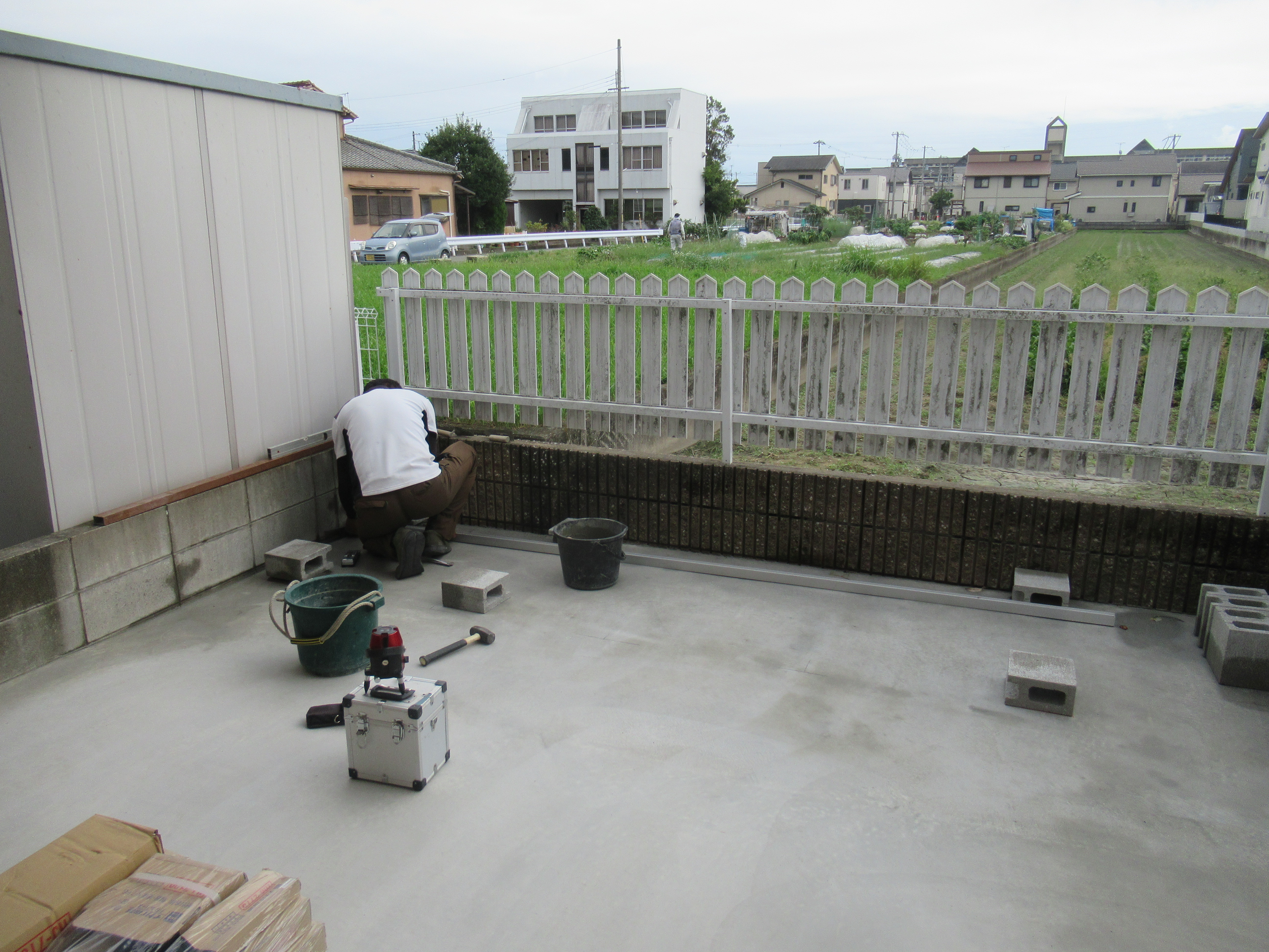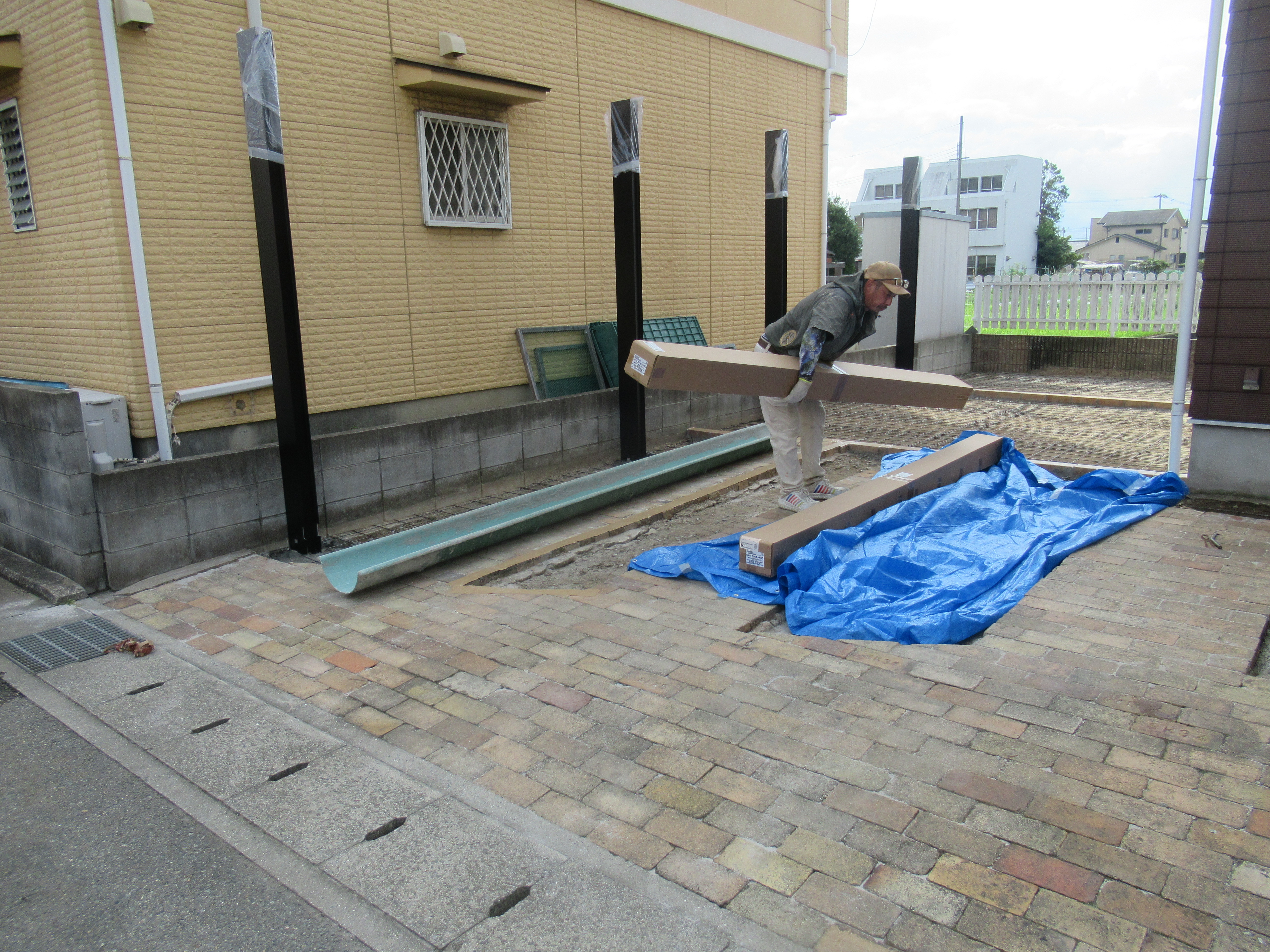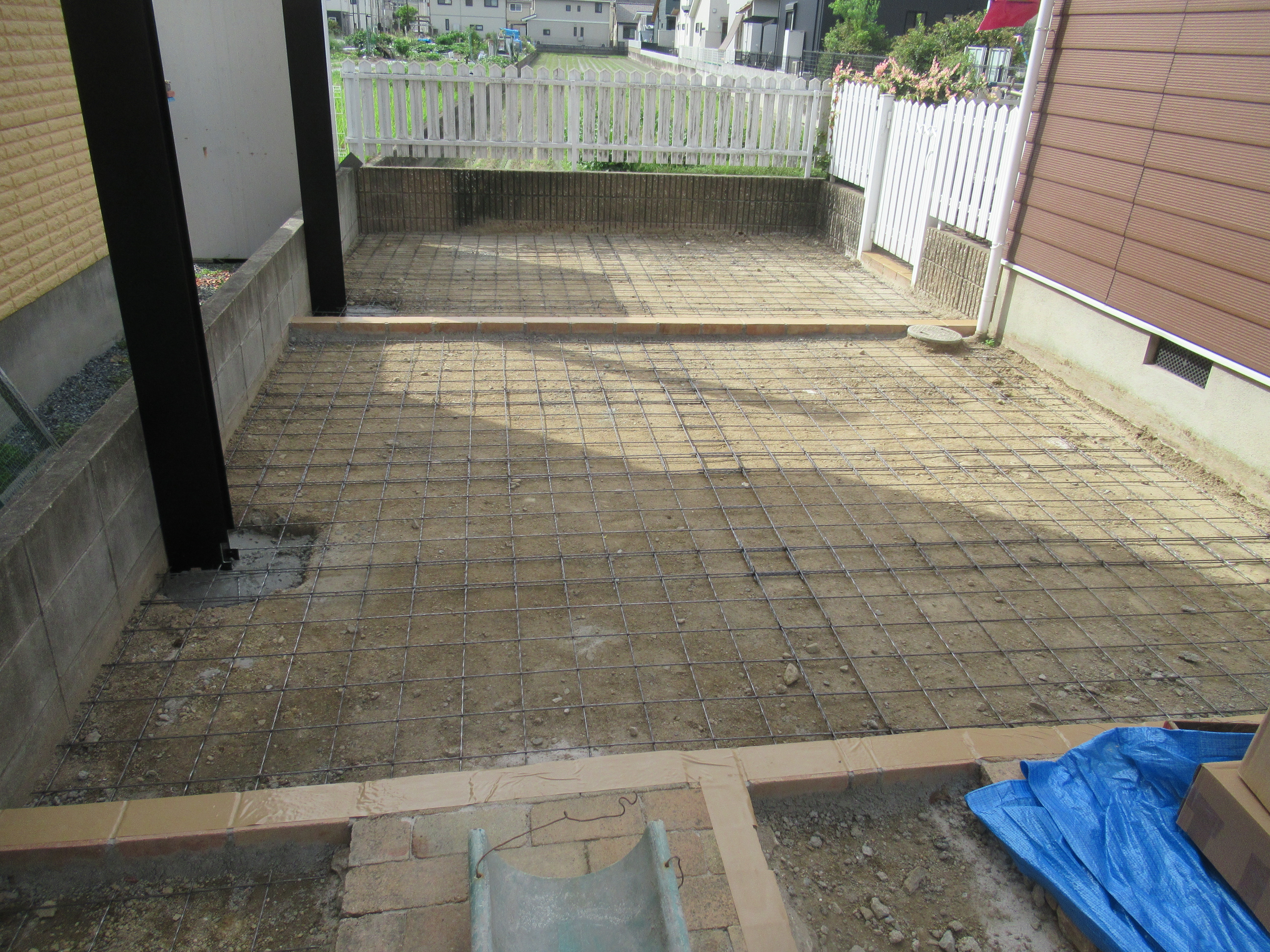 基礎をコンクリートで固めています、土間コンクリートが固まってからカーポートSCを組み立てる予定です。