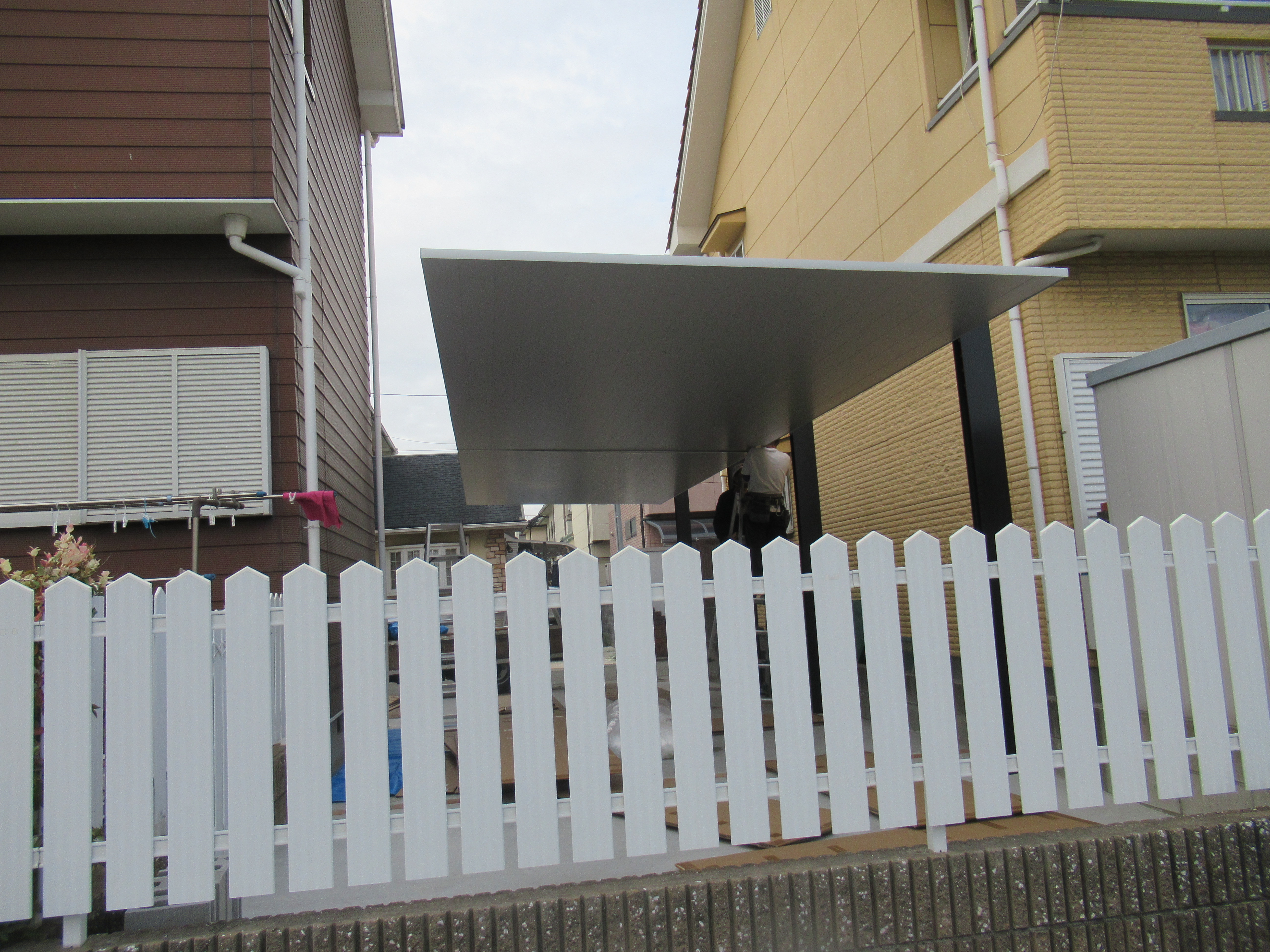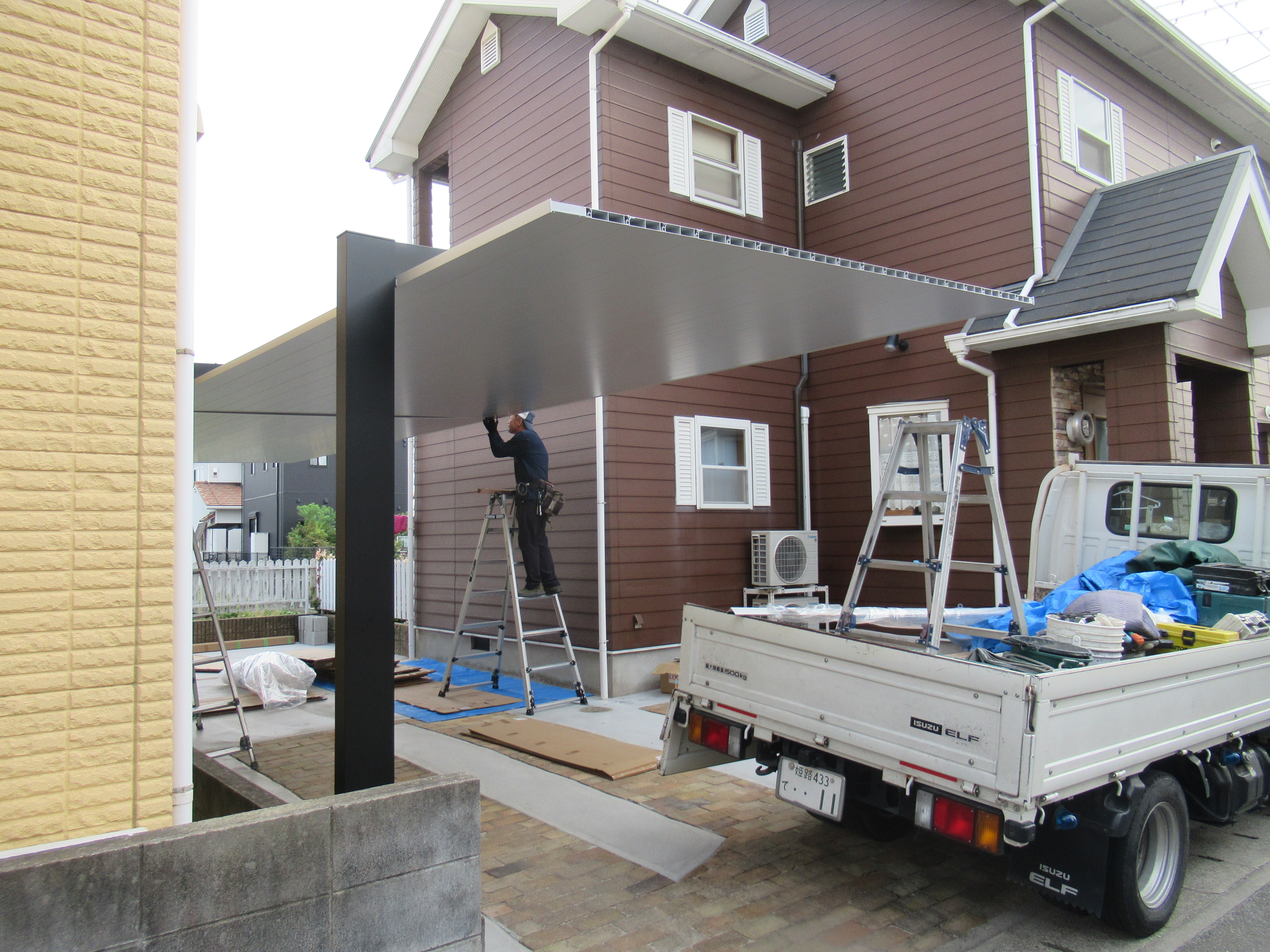 カーポートSCは5mの屋根材を梁2か所に取付けるので、職人さんは二人一組でないと施工できません。
