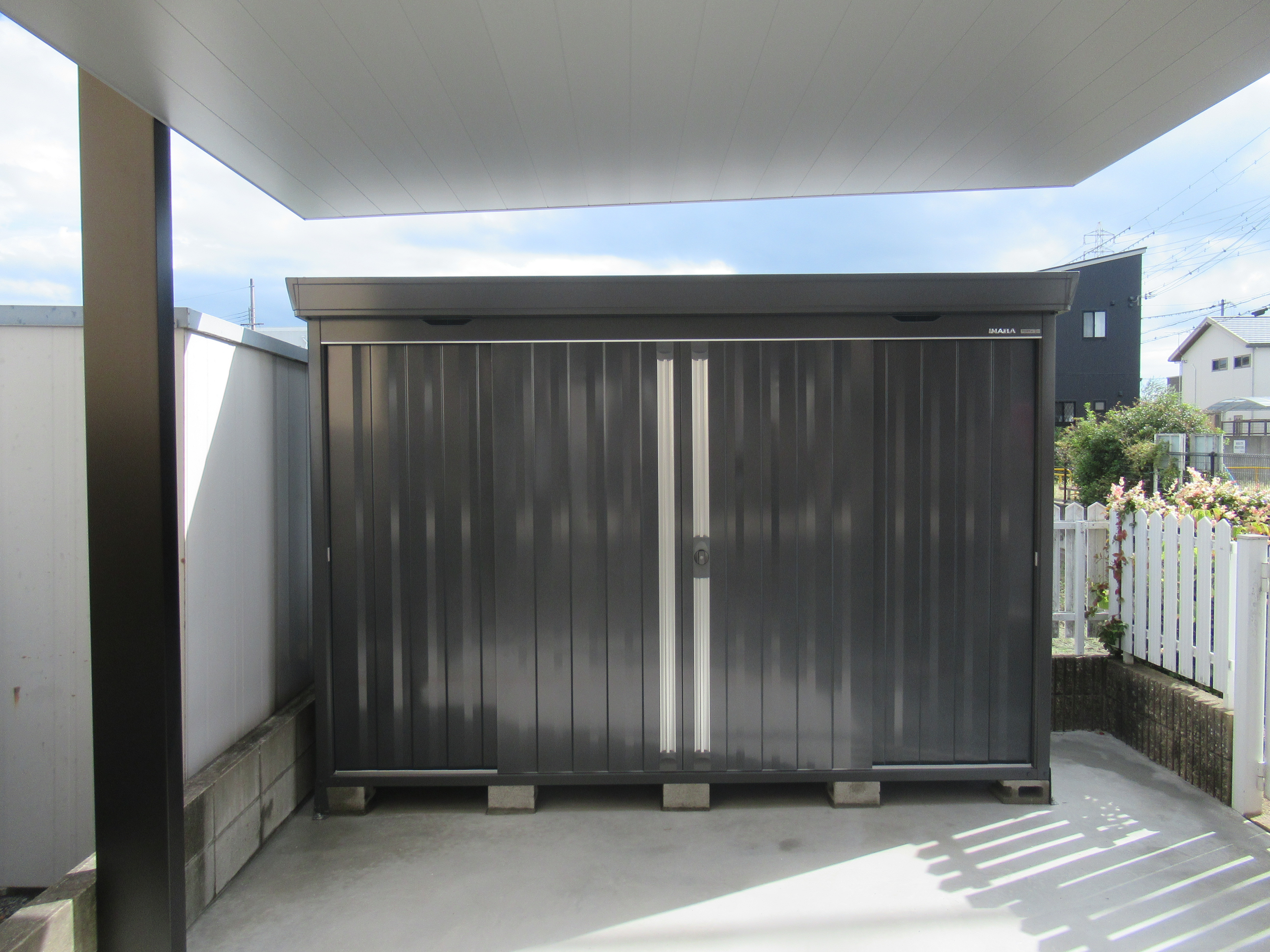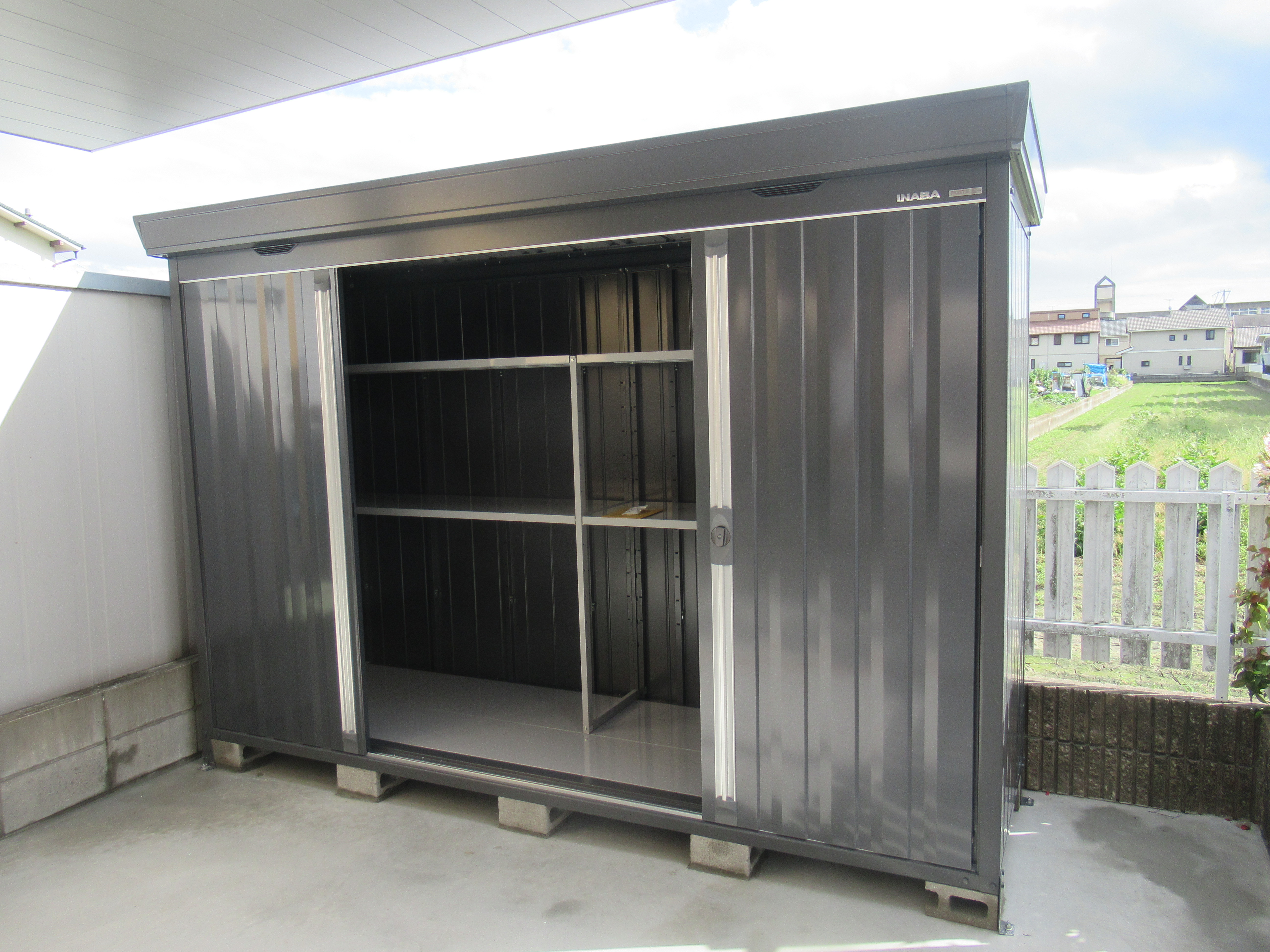 イナバ物置・フォルタFS-3009SFが完成しました、本体がフランネルグレー・扉がチャコールグレーのおしゃれな物置です、物置に見えないですね。