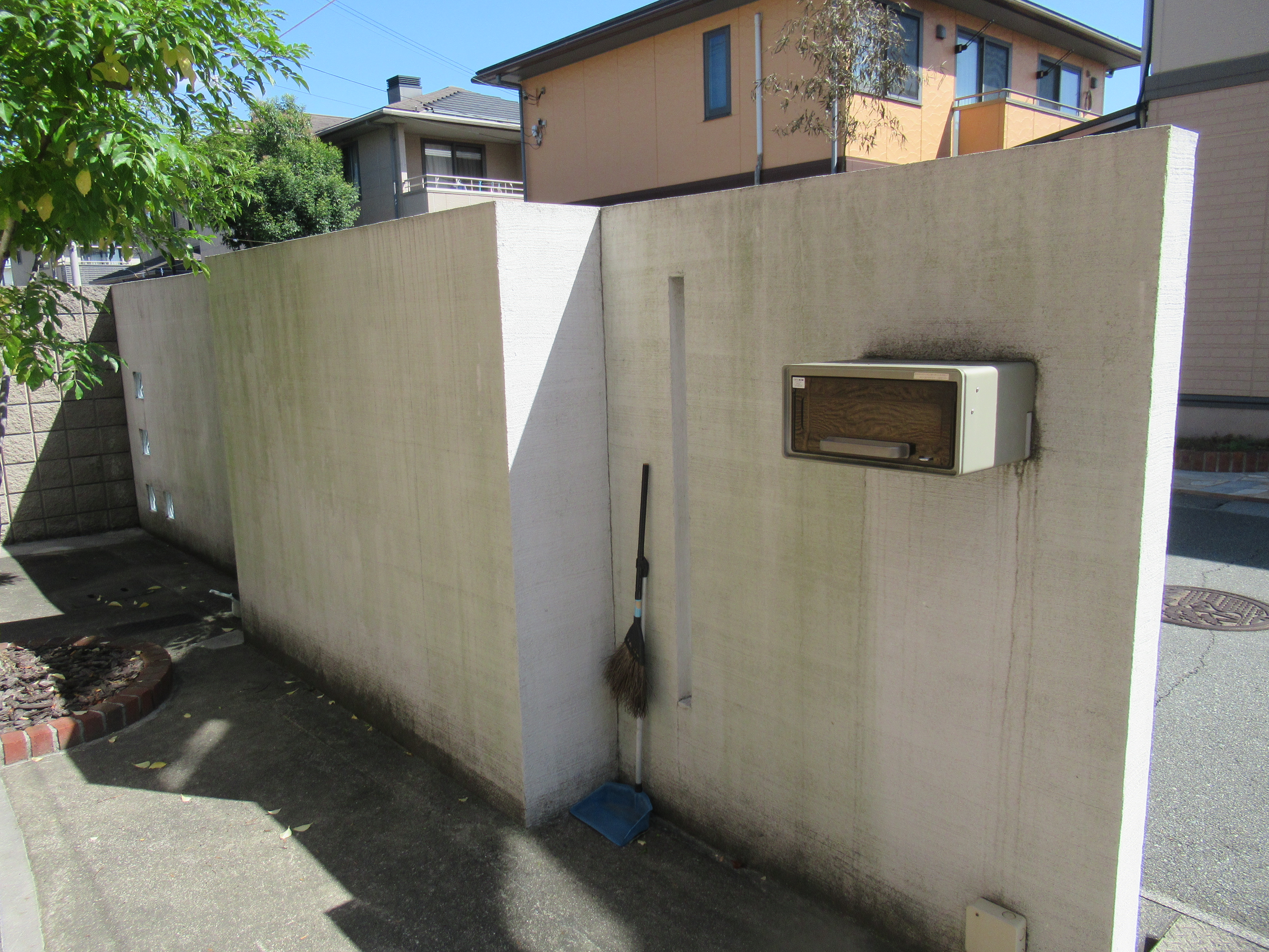 門柱・塀の裏面は緑に汚れて、天端から流れた汚れが縞模様になっていました。