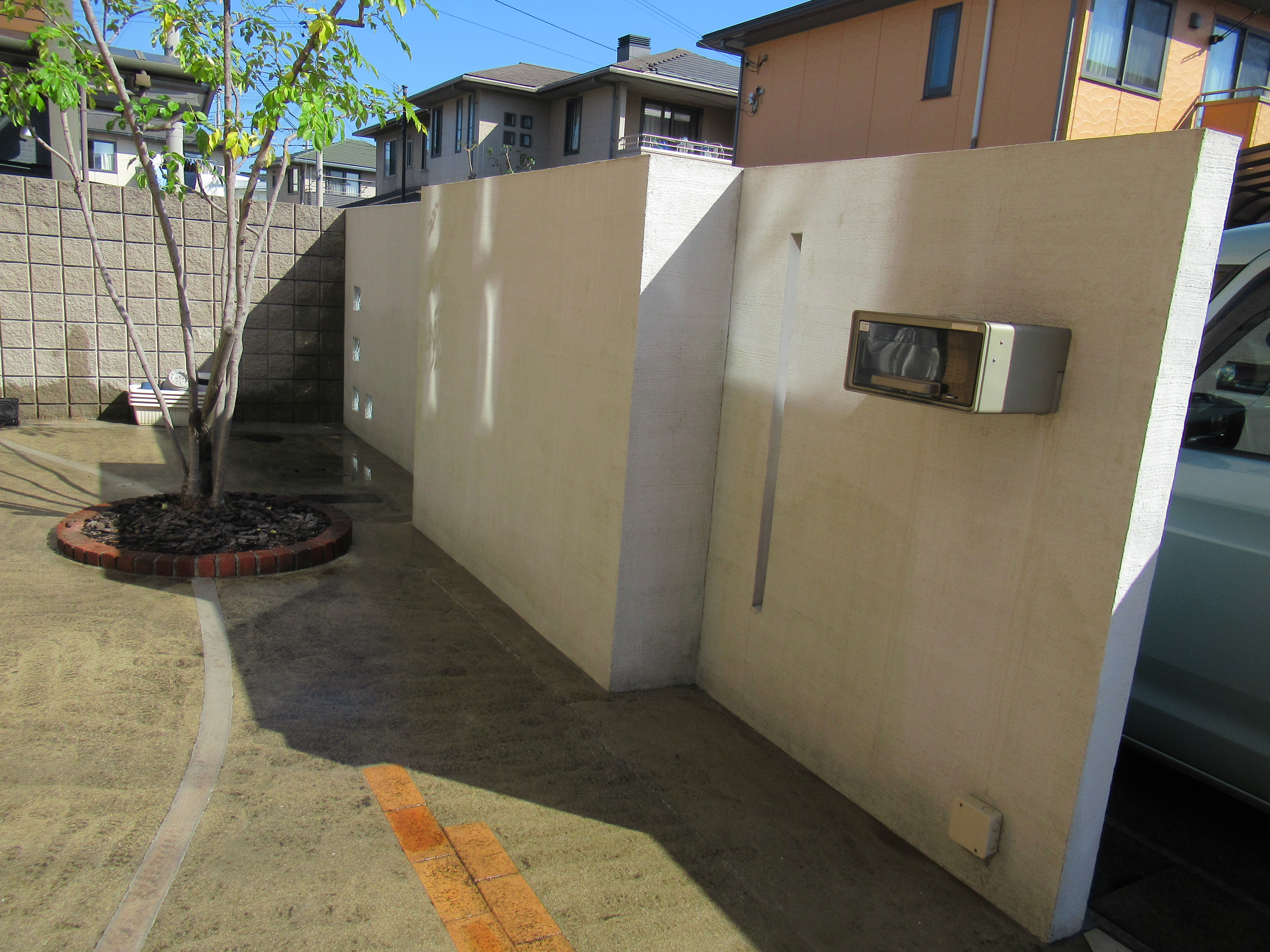 塗り壁の門柱・塀の高圧洗浄は5年ぶりです、排ガスの汚れ?で表面はかなり黒ずんでいます。