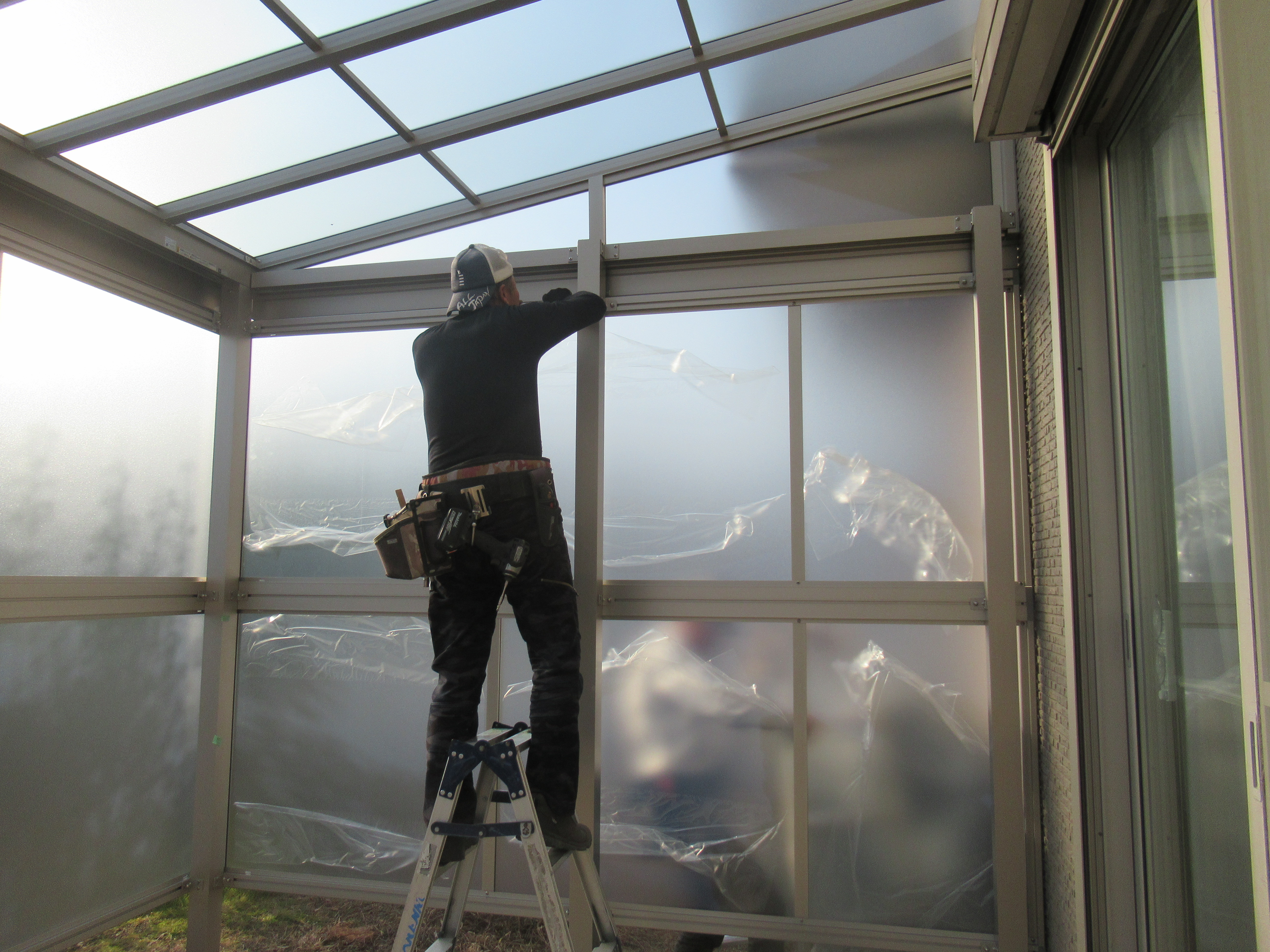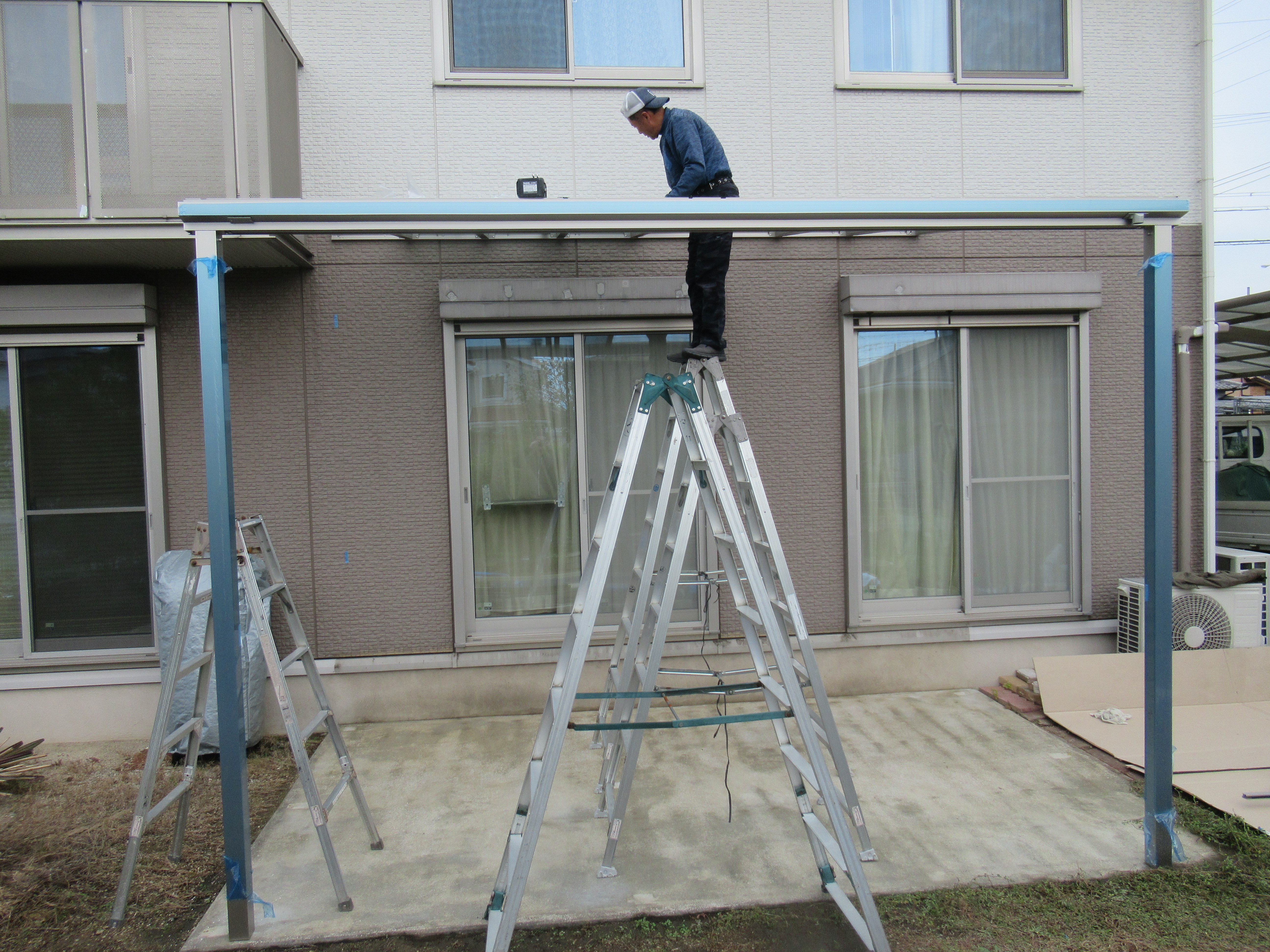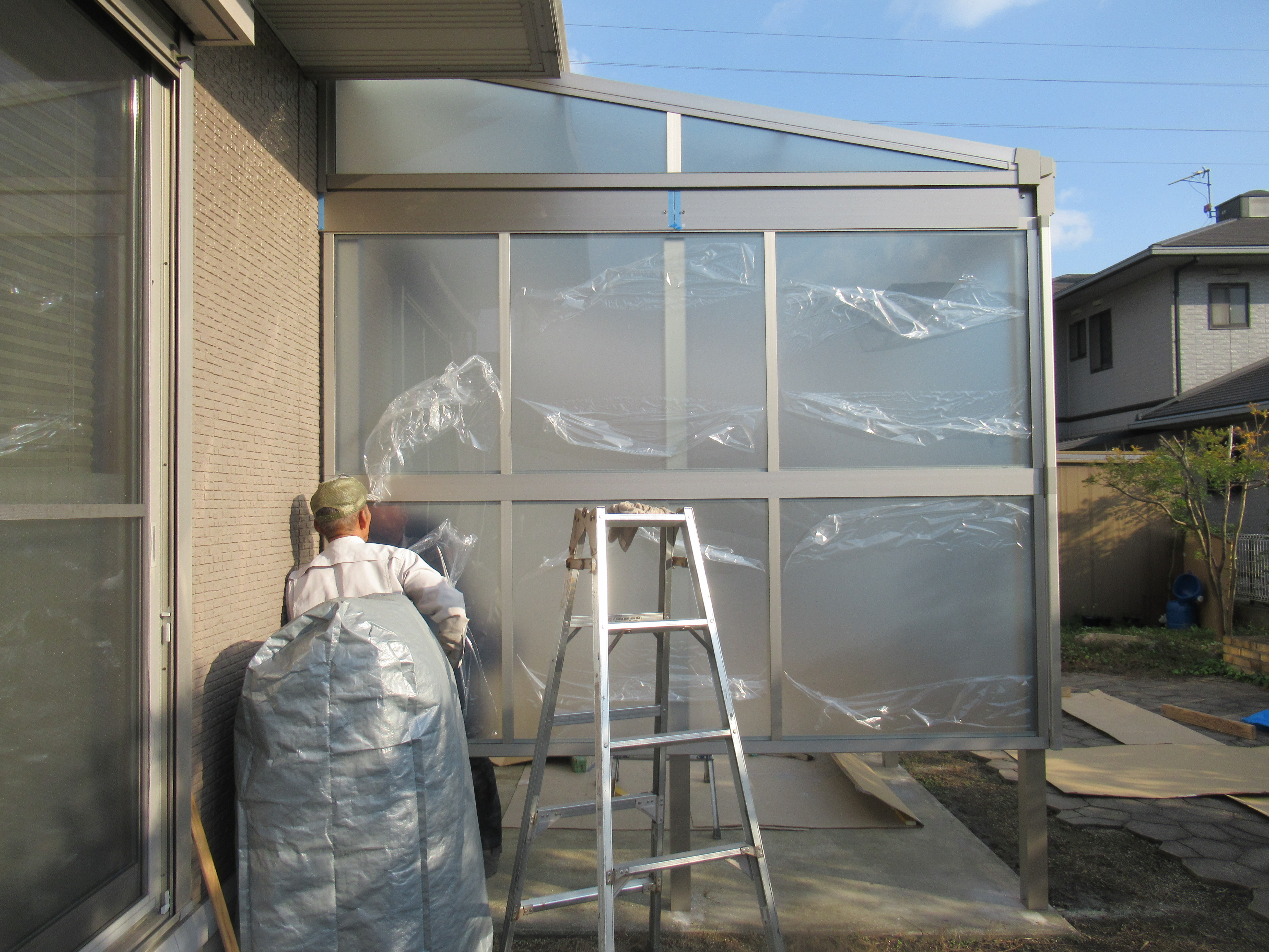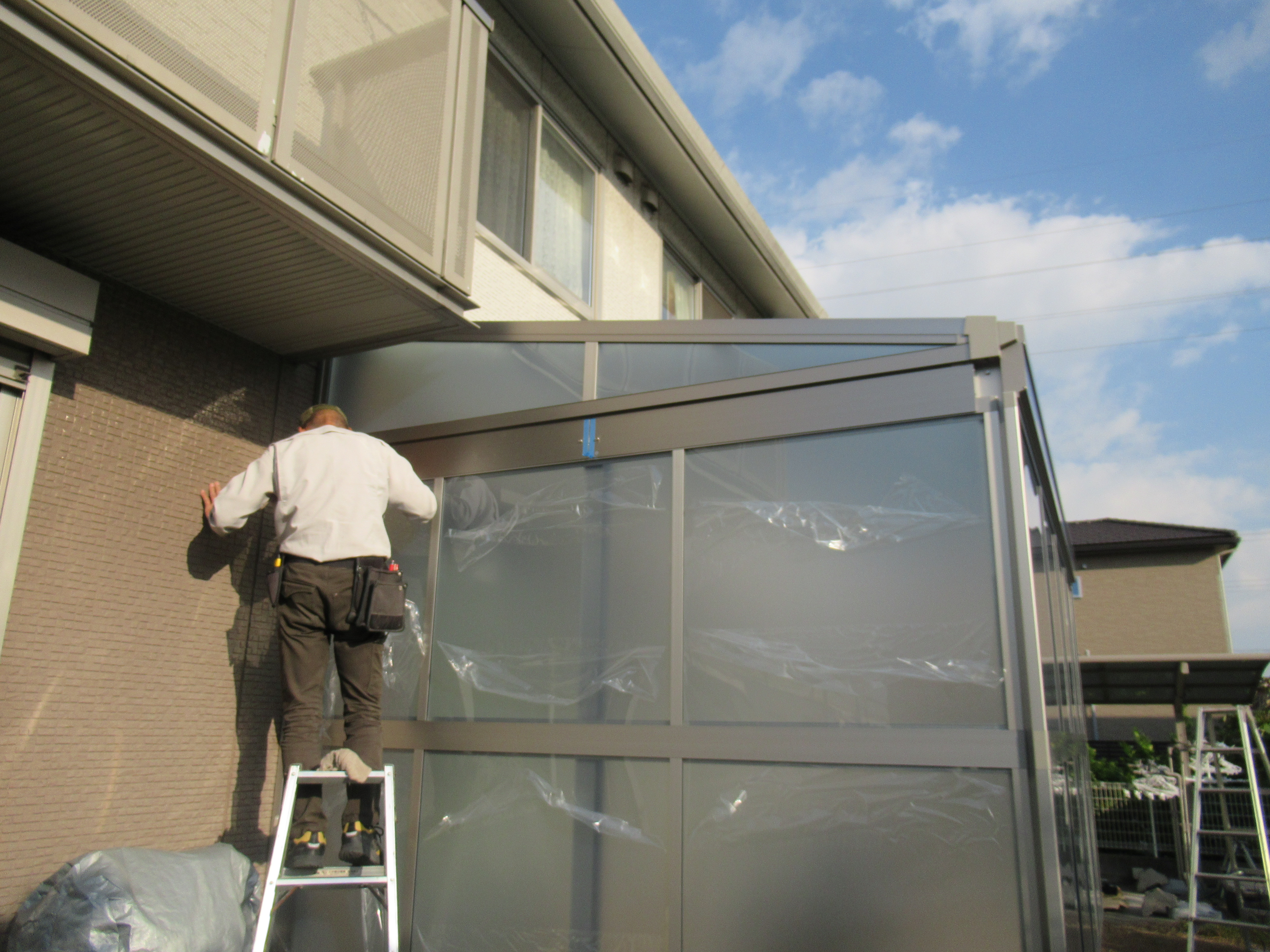 撤去後にテラス屋根と前面スクリーン・側面スクリーンでバイク庫を作るので、今回はアルミ職人さん二人がかりで施工します。