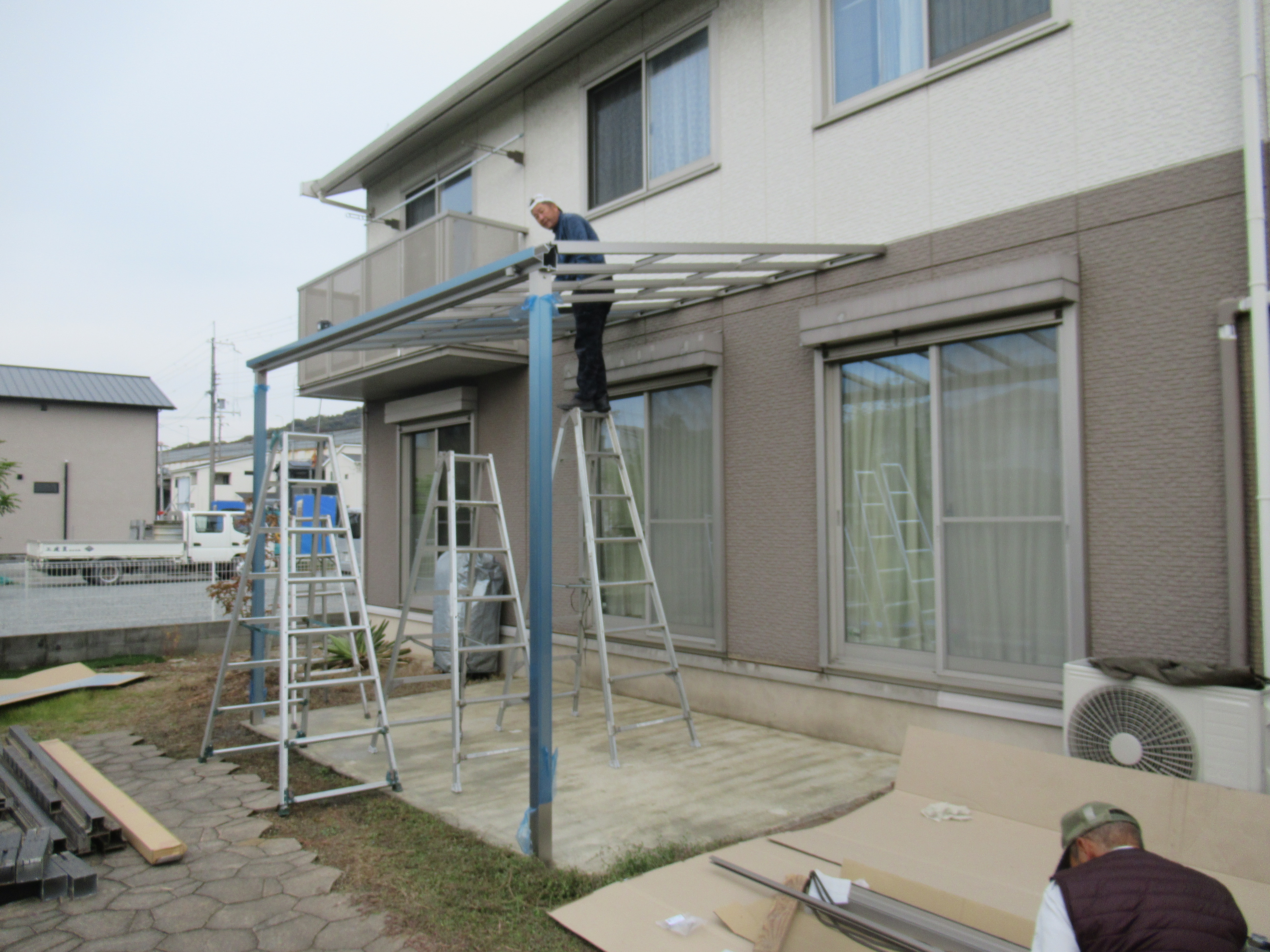 テラス屋根の組立中です、YKKのソラリアテラス屋根600タイプ1階用・幅4m・出幅2.9mの大きなテラスです。