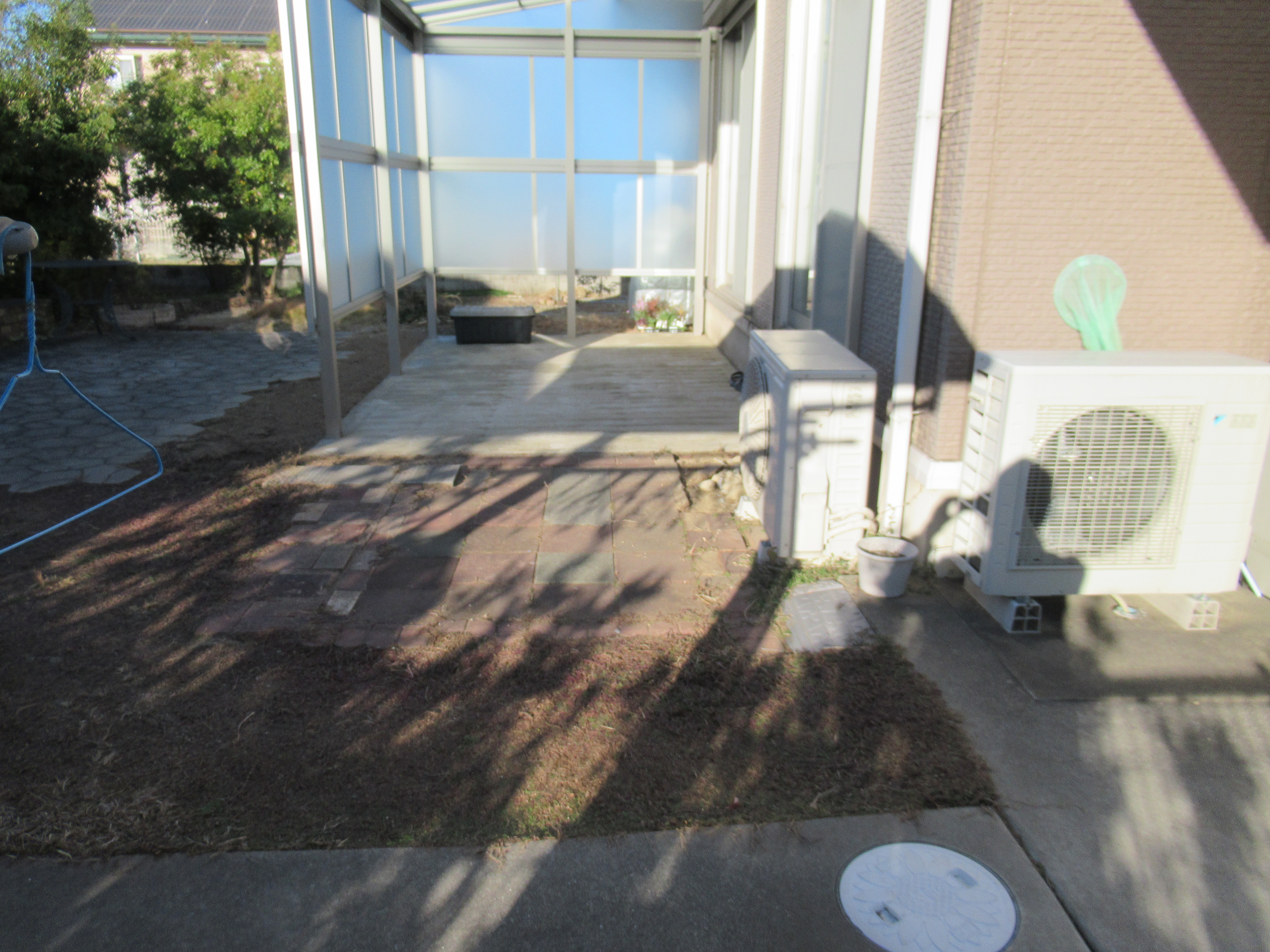 17年前にガーデン工事を作らせていただいたお客様の使わなくなったウッドデッキを撤去してテラス屋根でバイク庫を作りました。