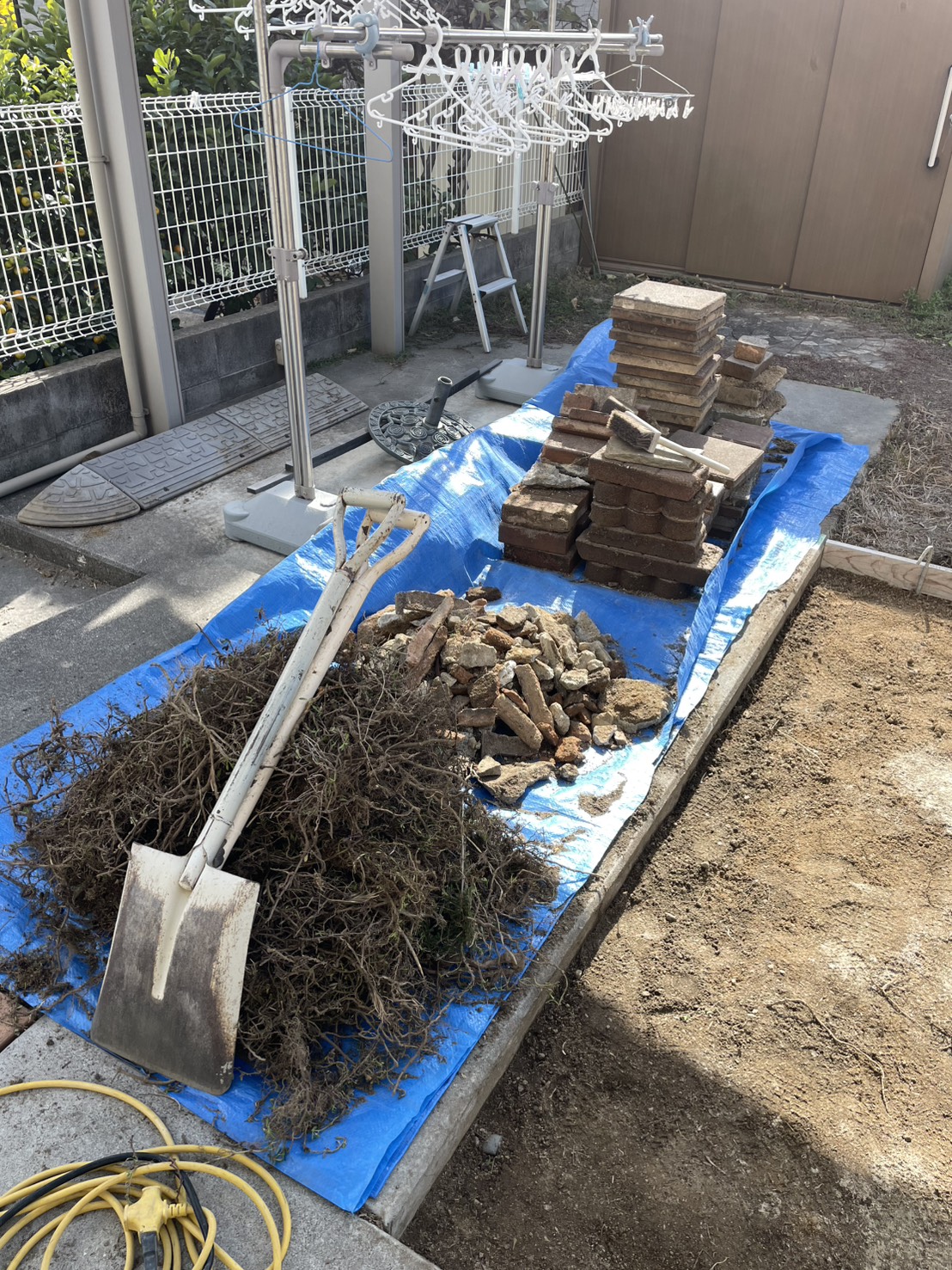 掘り起こしたレンガ・平板、がら、雑草です。