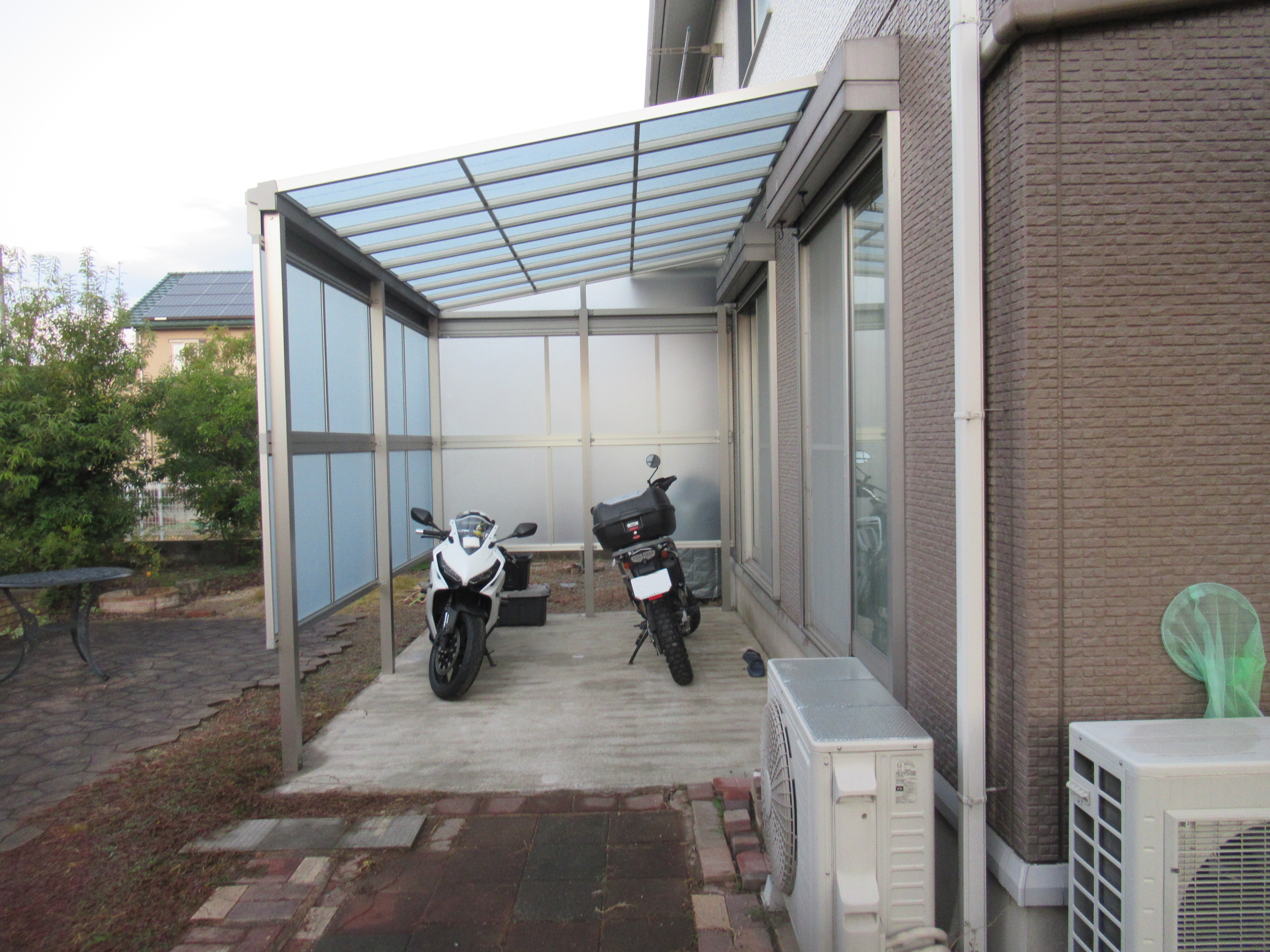 バイク庫の完成後の写真です、ご主人と息子さんのバイクが2台停まっています。