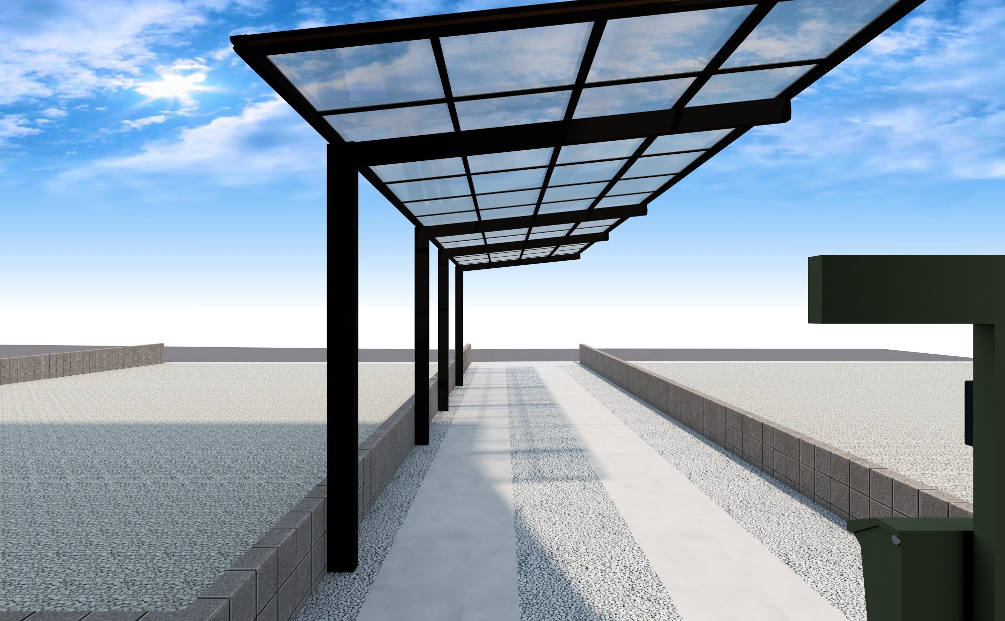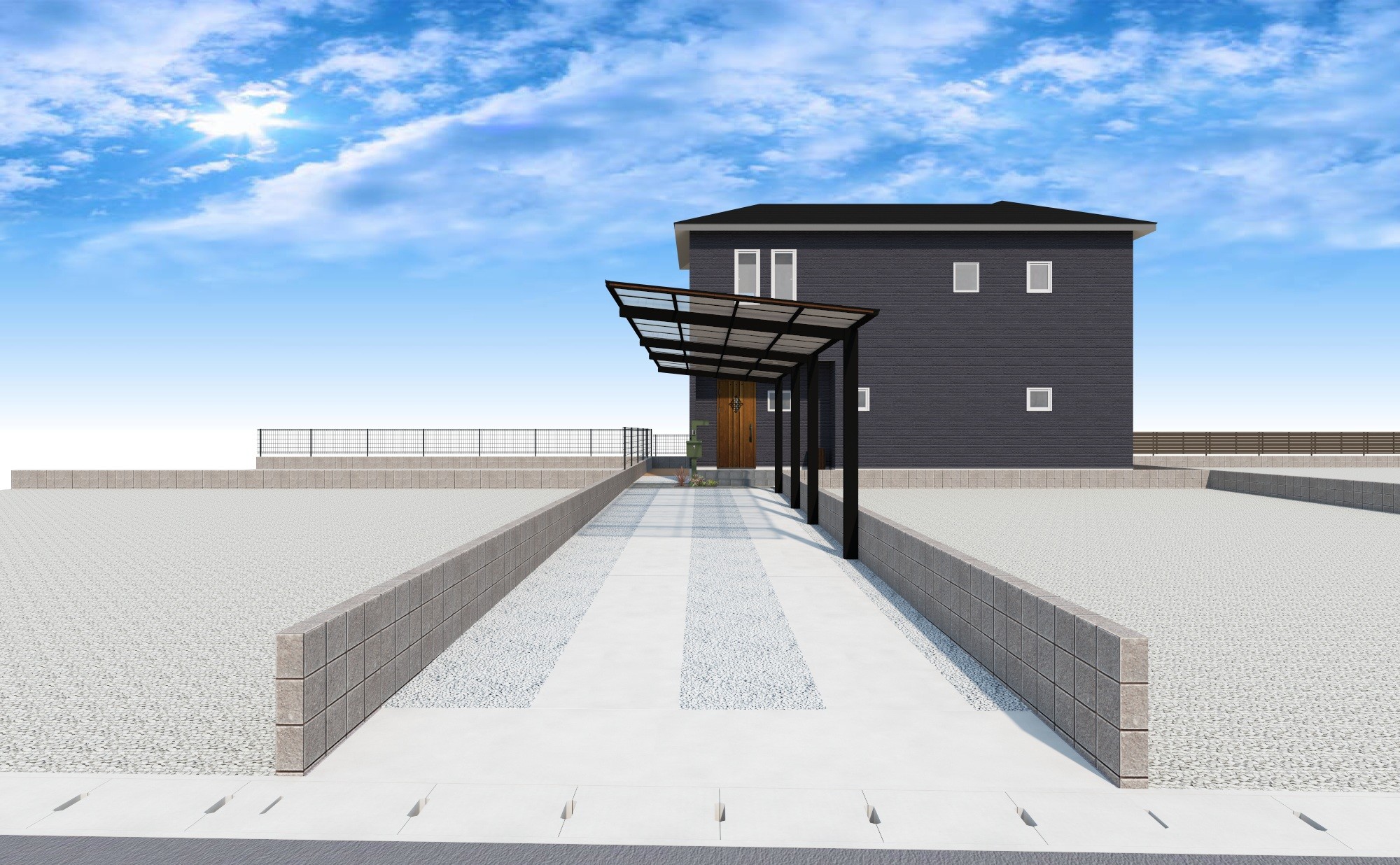 先に完成していた前庭部分です、カーポートSCのカラーリングを活かすために枕木と白礫砂利・白栗石のコントラルトに仕上げています。