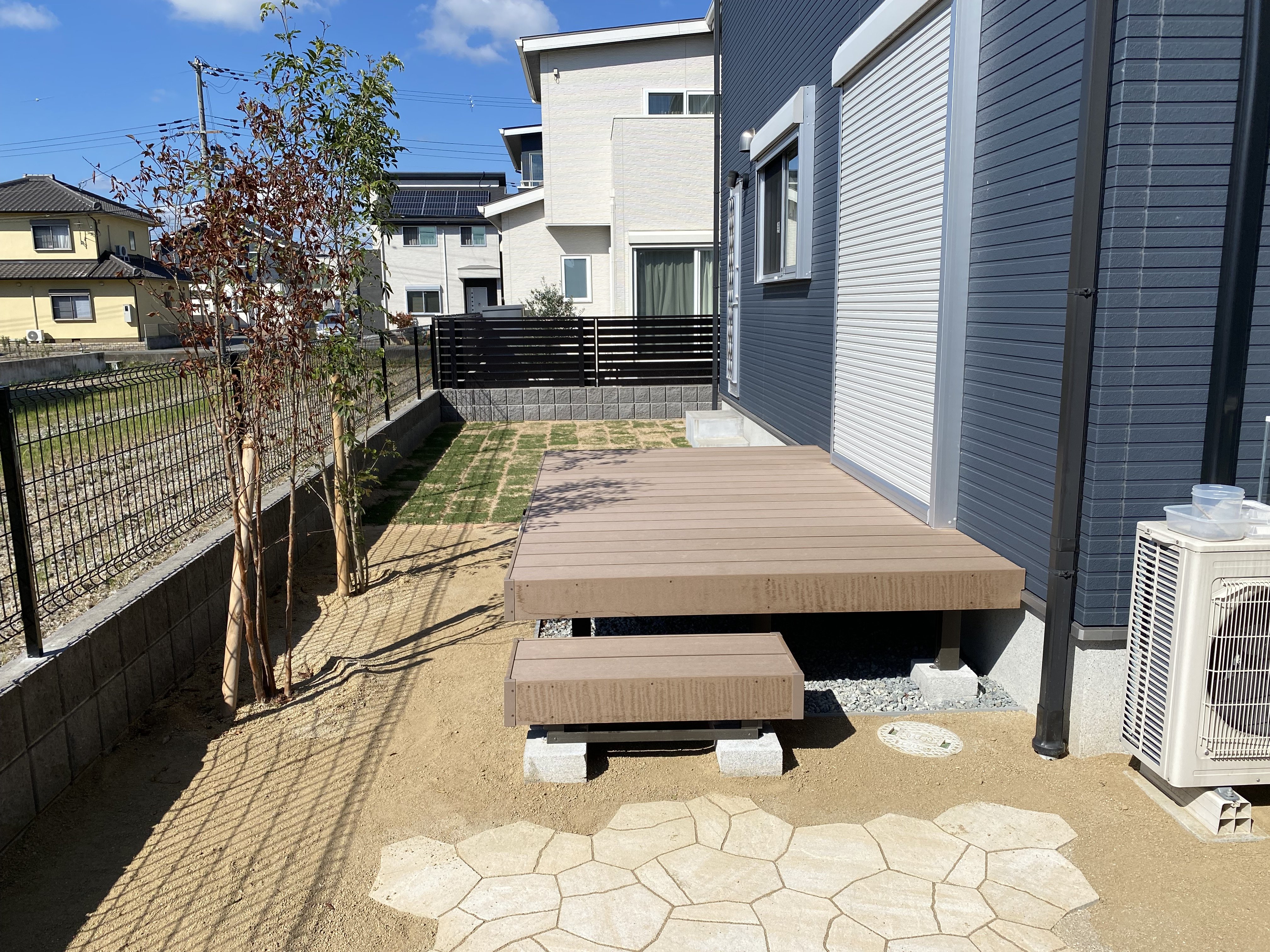 省管理型コウライシバ・tm9を敷いて人工木デッキとティーナテラスのバーベキューコーナーを作らせていただいていました。