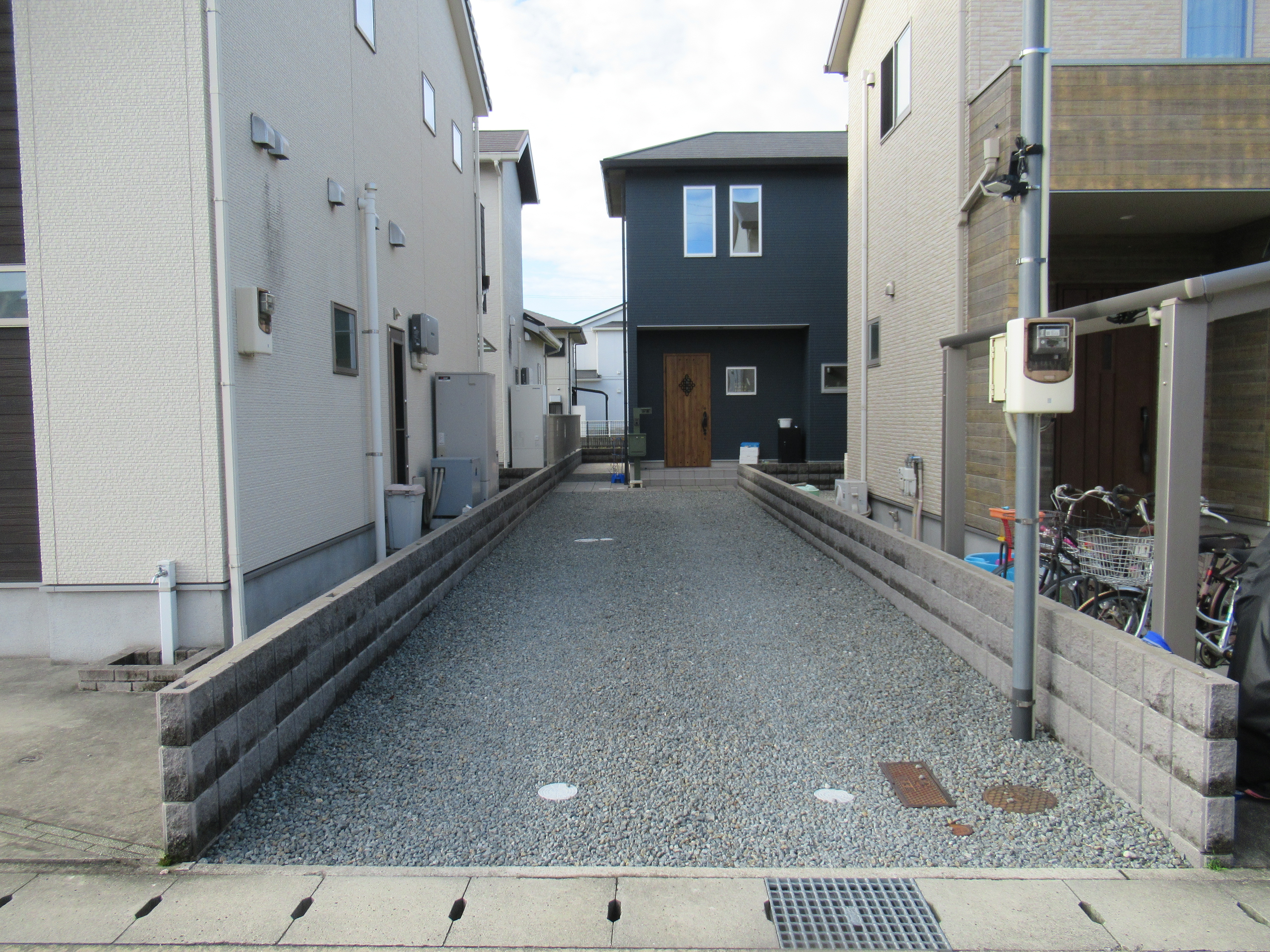 車3台が縦列駐車できる長いガレージは、砂利敷きのままで四年間お使いいただきました。
