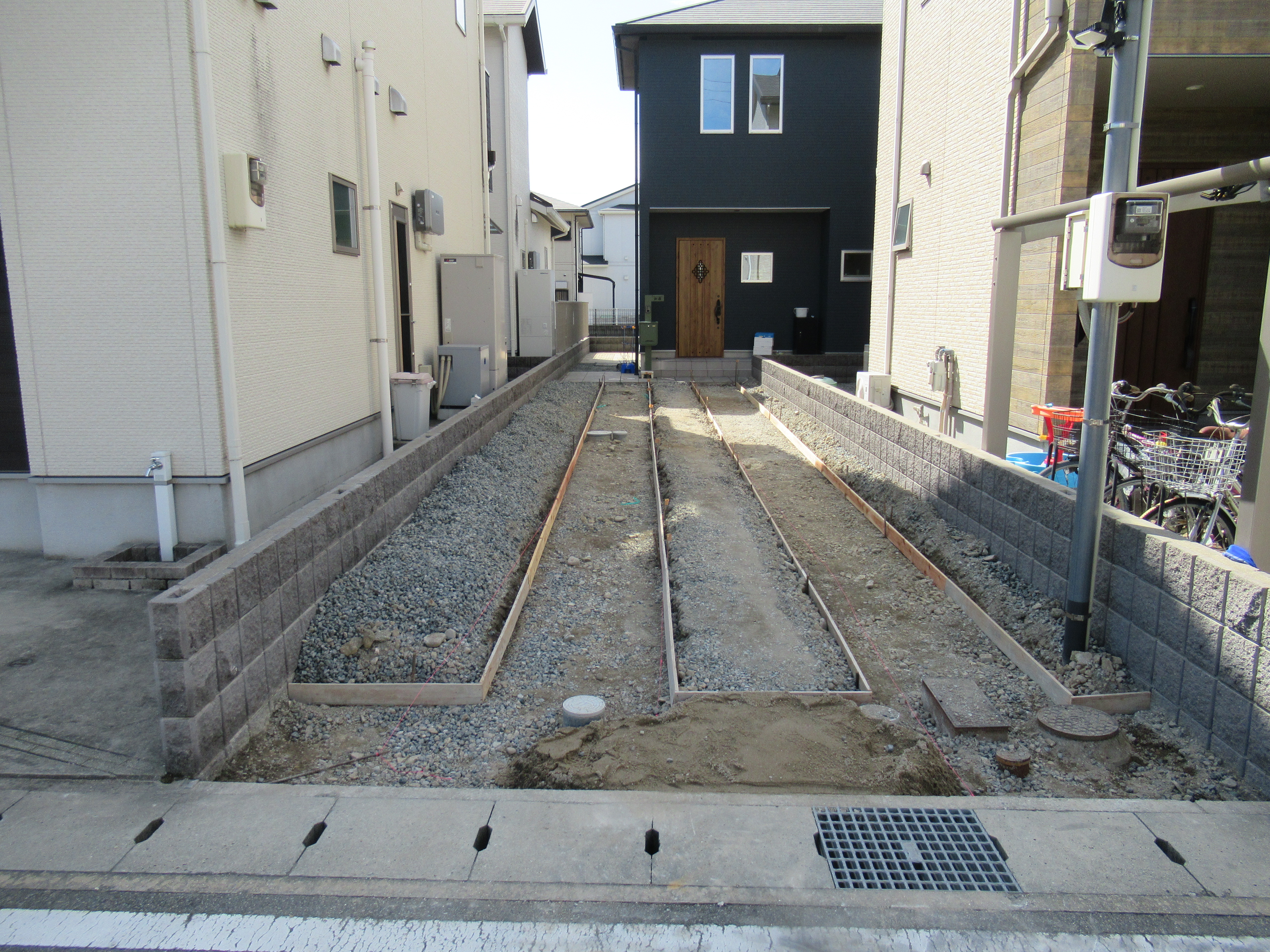 ユンボで砂利を鋤取って、轍の形に型枠を入れています。